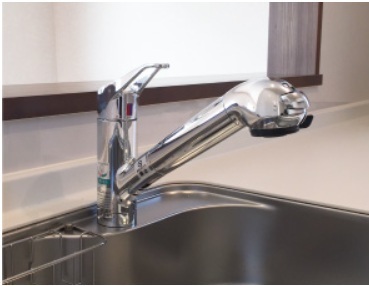 浄水カートリッジ内蔵で場所を取らずにスッキリ。水栓は使い勝手の良い、取り外し可能なシャワーヘッドタイプ。