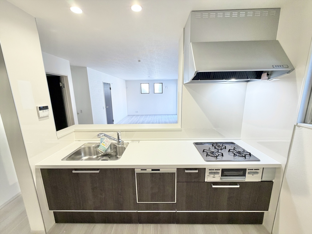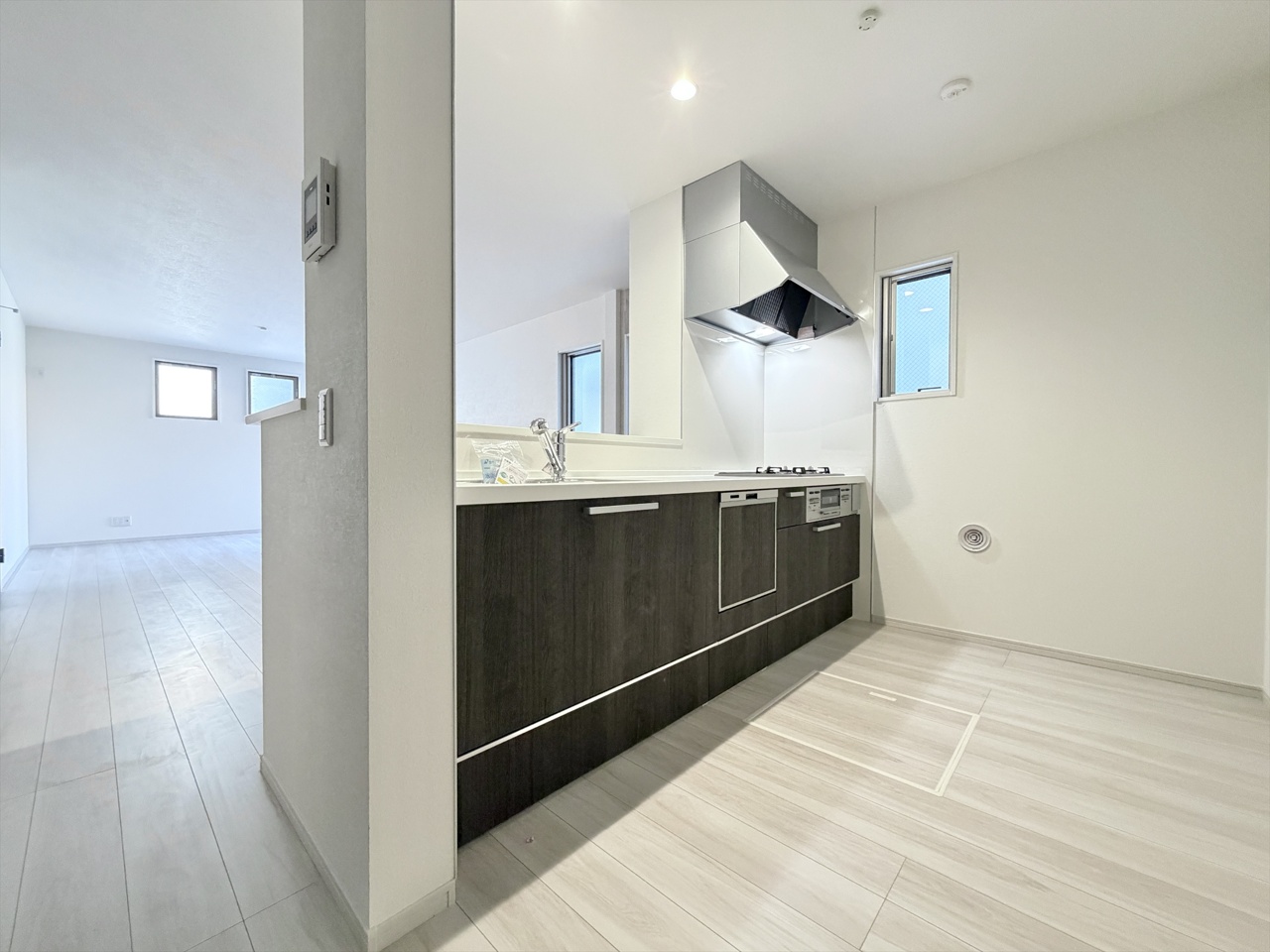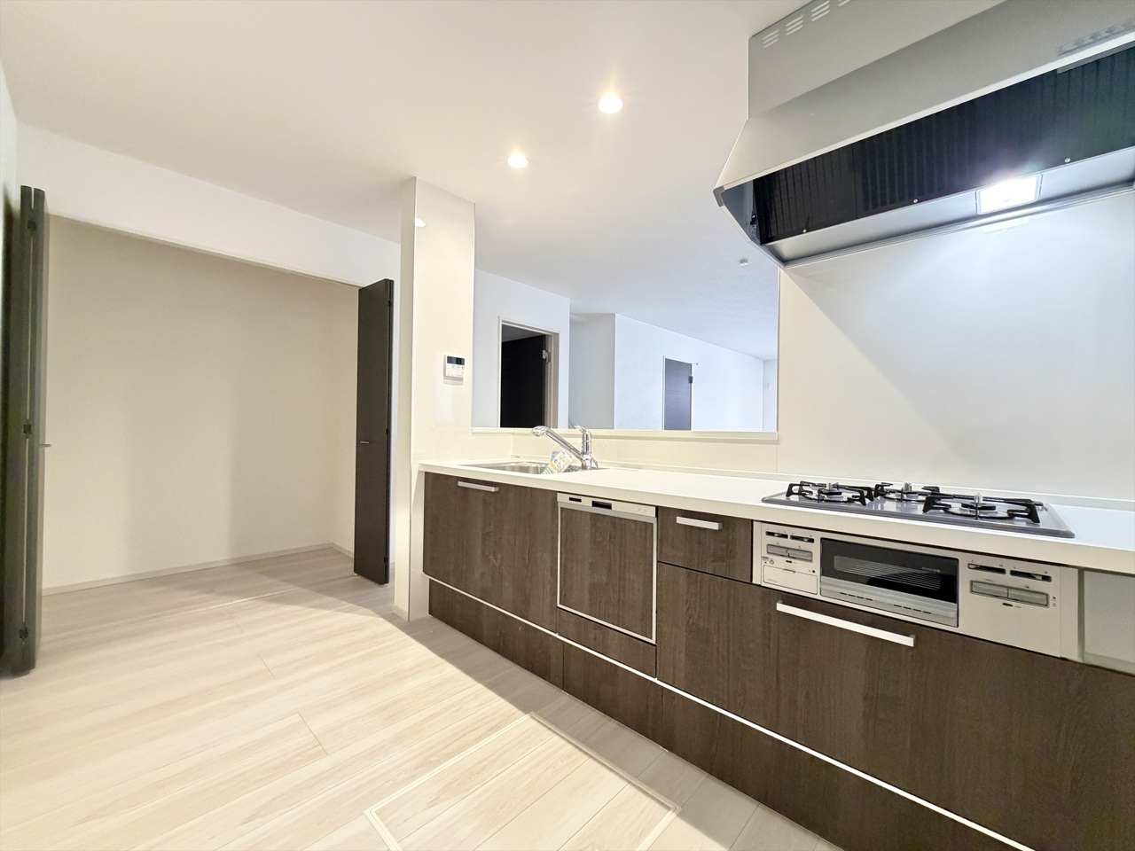 対面式システムキッチン。キッチン横には容量豊富なパントリーとして使用できる収納があります。キッチン周りをスッキリ利用可能。