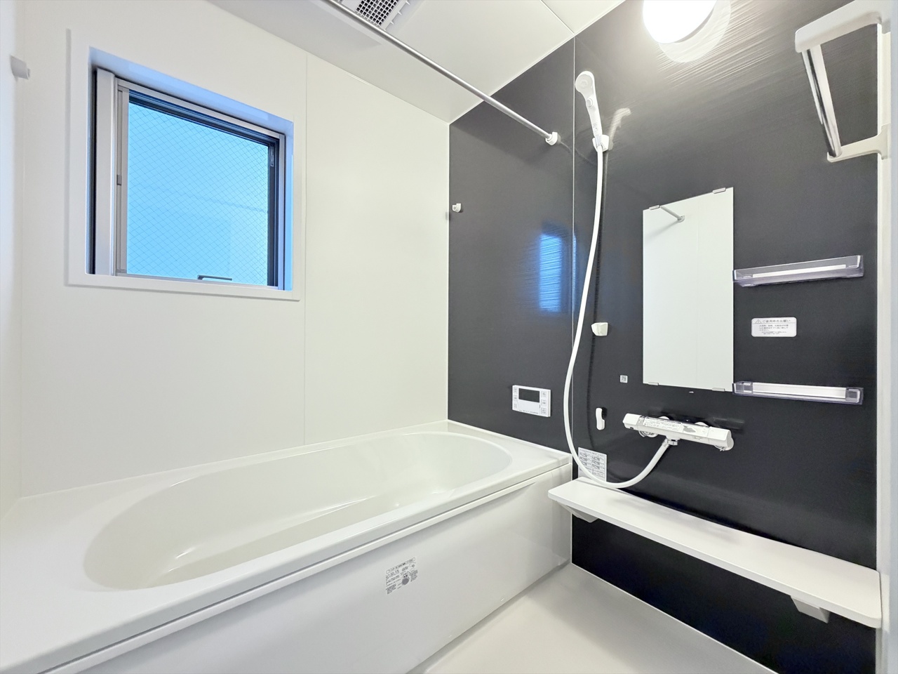 窓付きの浴室暖房換気乾燥機付きバスルーム。