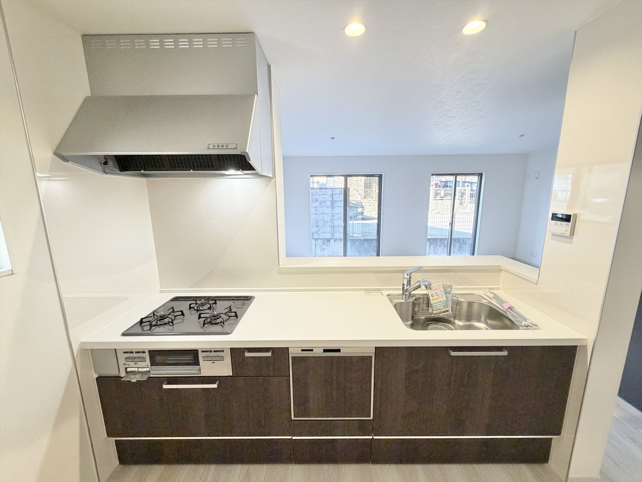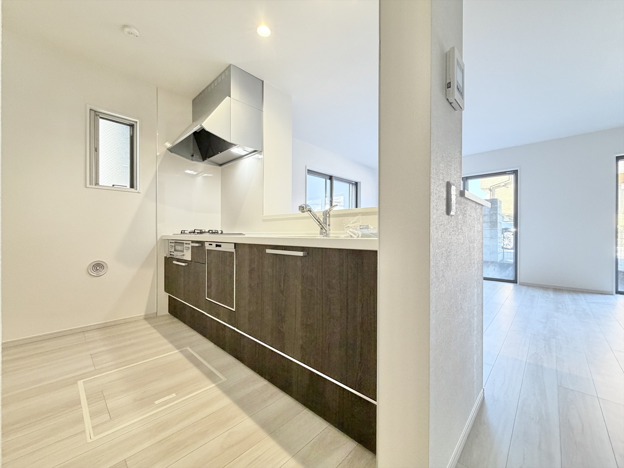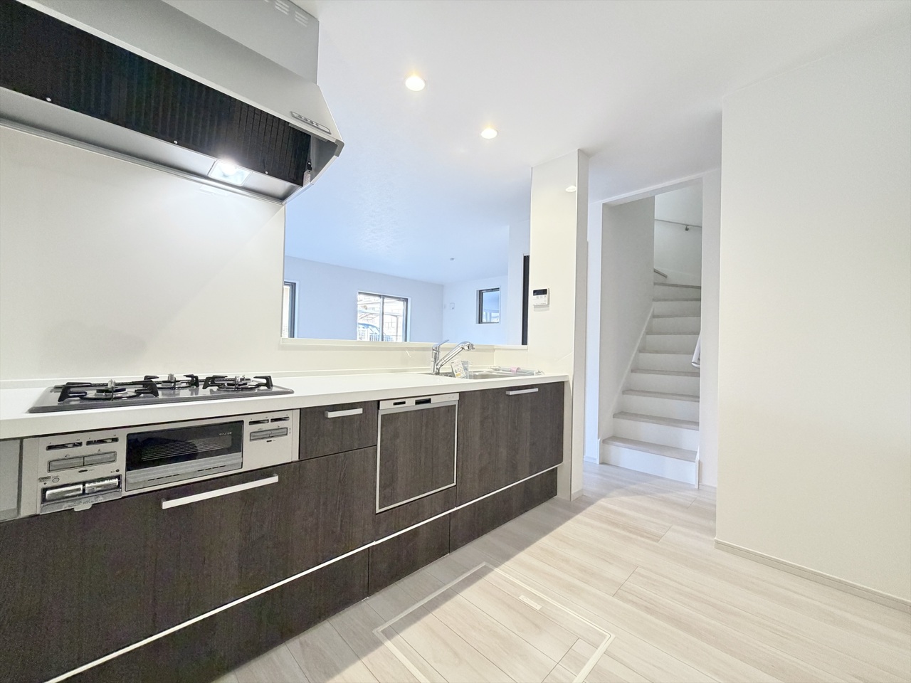 3号棟。開放的な対面式システムキッチン。床下収納、食洗器といった設備あり。是非一度ご覧になってください。