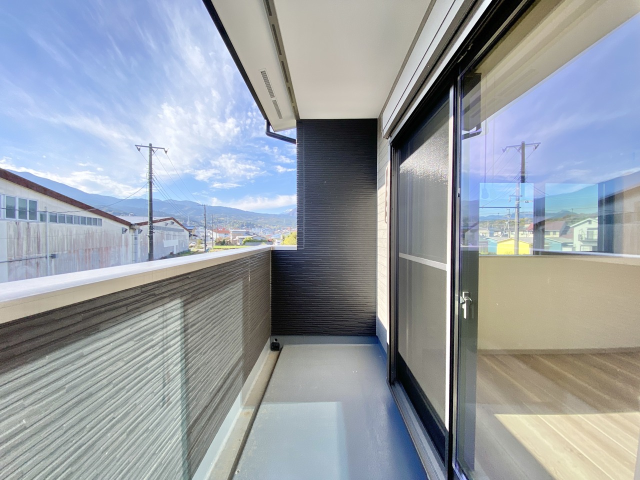 バルコニーは広々としております。また、バルコニーからは山々を望めてとても気持ちが良いです。