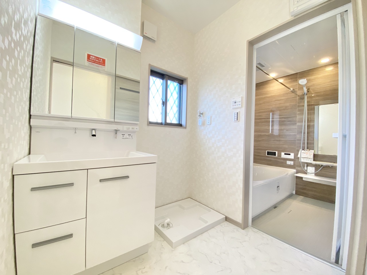 洗面室には、3面鏡の洗面台を採用しております。また、防水パンも標準装備しているのも嬉しいですね。