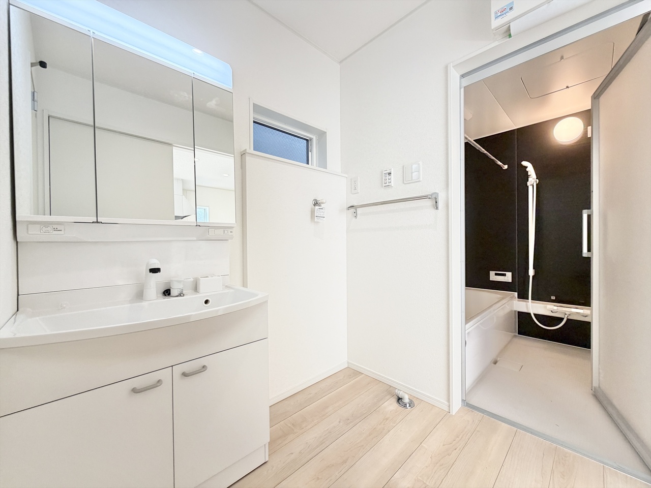 2号棟 散らかりがちな洗面台は、鏡裏や足元収納付きでスッキリ整頓いただけます。