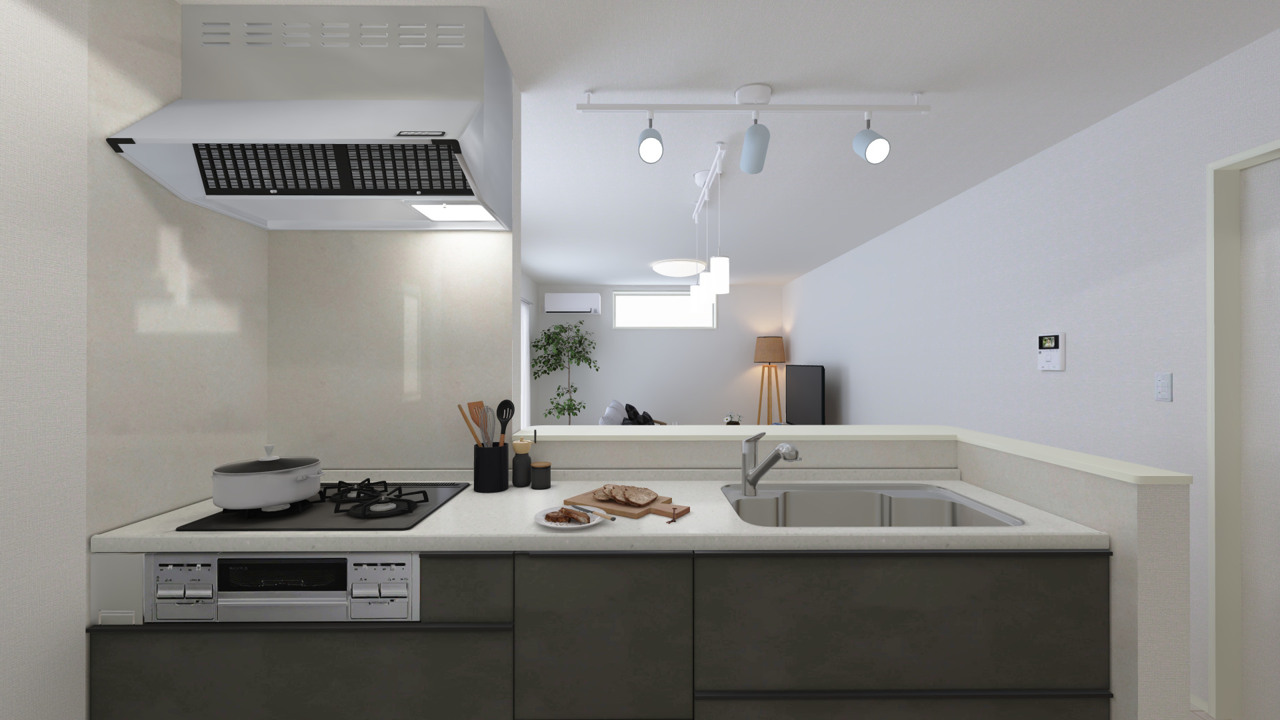 料理をしながらリビングにいる家族との会話を楽しめる対面式キッチン