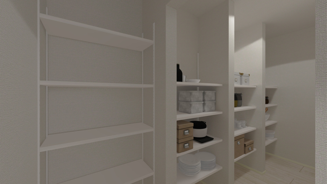 キッチン裏側には、ストック収納等に便利なパントリー収納付き。