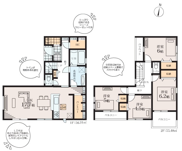 | 間取 | 4LDK (LDK17.7帖、洋室6.2帖、洋室6帖、洋室5帖、洋室4.5帖) | ||