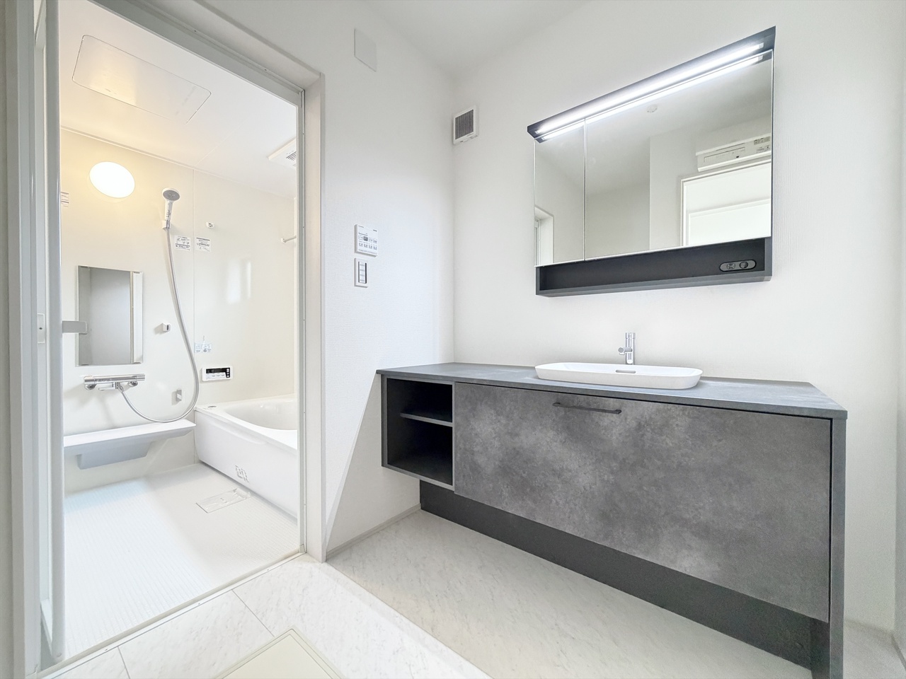 1号棟 グレー×ホワイトのお洒落な洗面台。収納も充実◎