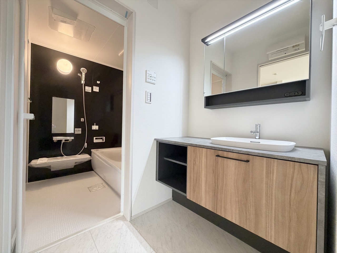 1号棟 ホワイト調で清潔感のある明るい浴室。乾燥機付きの為、花粉時期でも洗濯物を干す場所に困りません。
