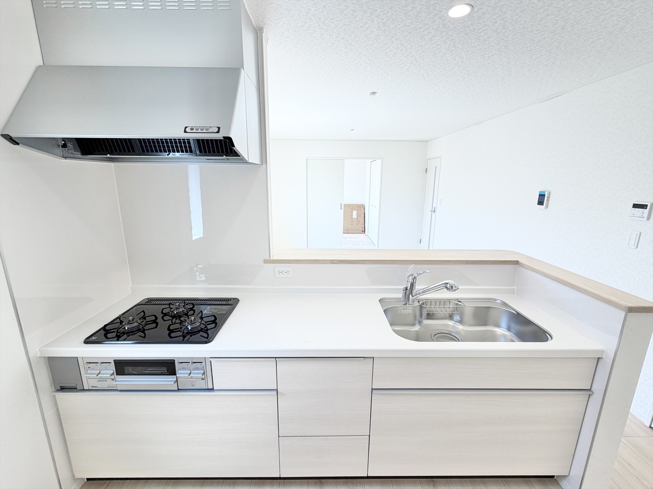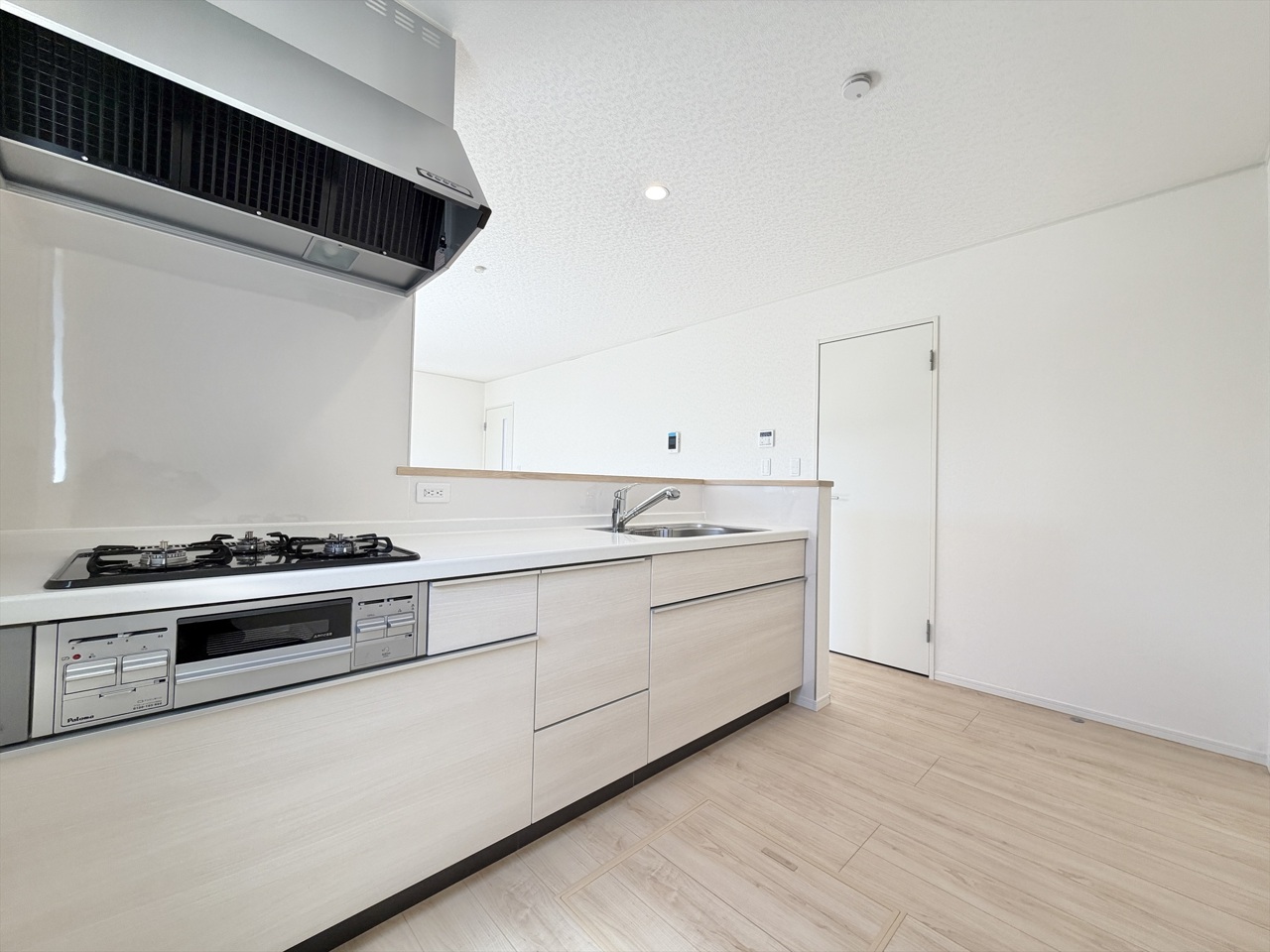 2号棟 スタイリッシュな対面キッチンで、家族や友人との会話も弾む空間。広々ワークトップと充実収納で毎日の料理がもっと楽しく、片付けもラクにできる心地よい住まいです。