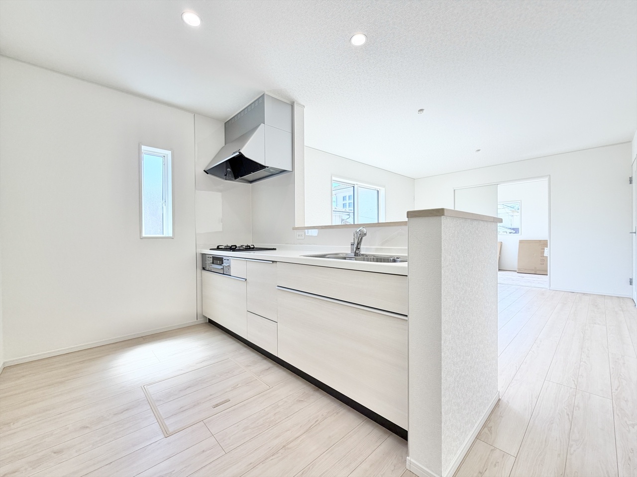 2号棟 明るいリビングとつながる開放的なキッチンは、家族との会話が自然と生まれる心地よい空間。使い勝手の良い設備が揃い、毎日の料理も楽しく快適に。自然光が差し込む爽やかなキッチンで、新しい暮らしがもっと好きになるお住まいです。
