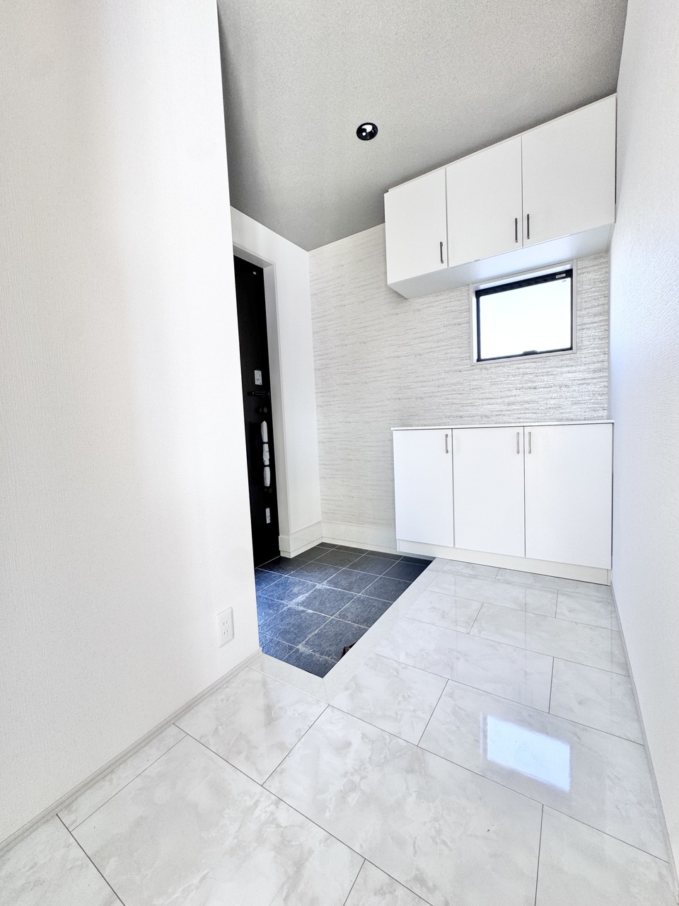 広々とした空間の玄関スペース。清潔感ある白を基調としたデザイン。心地よい朝をここからスタート