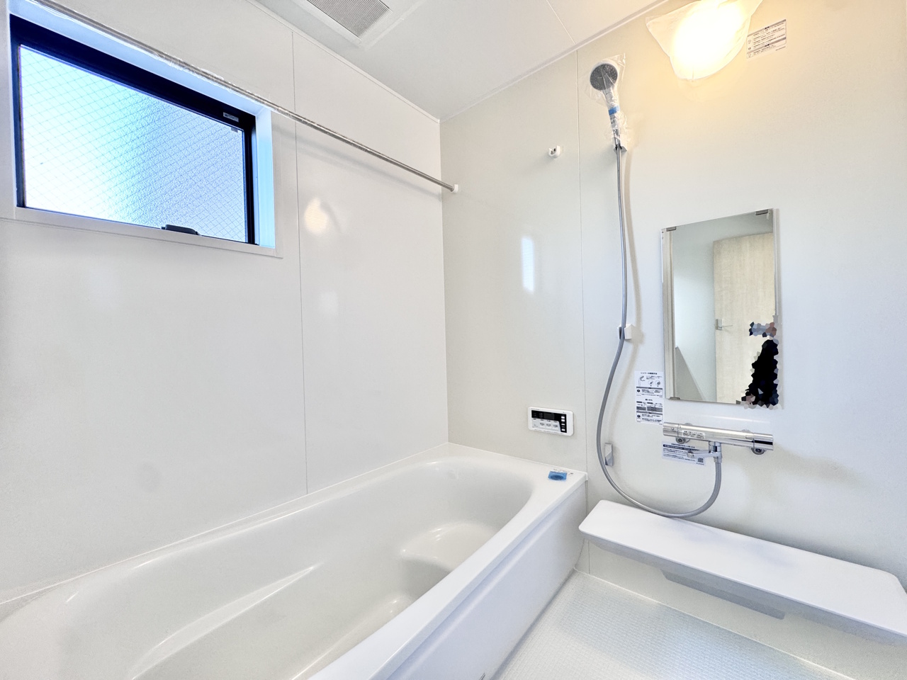 窓付きの浴室暖房換気乾燥機付きバスルーム。