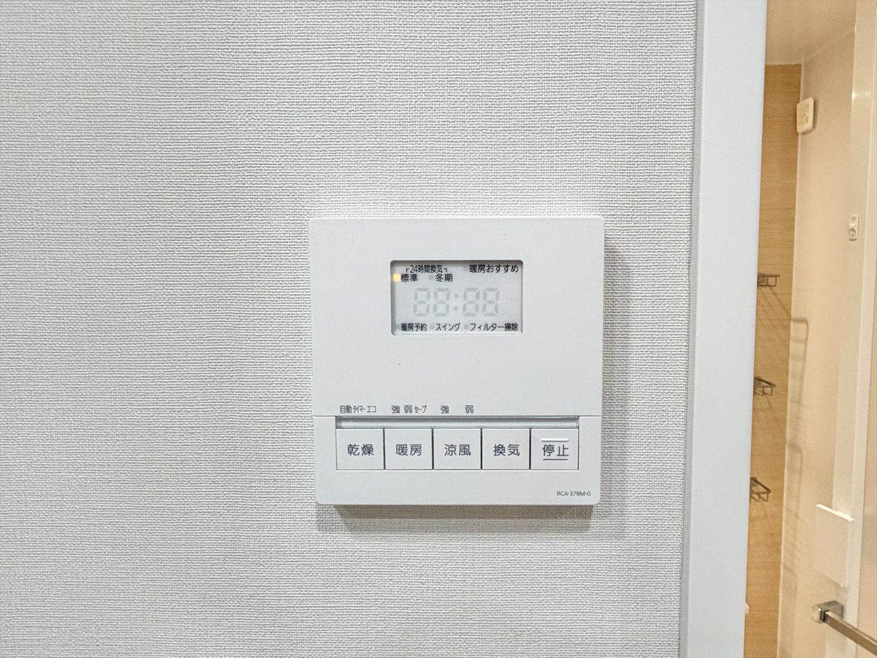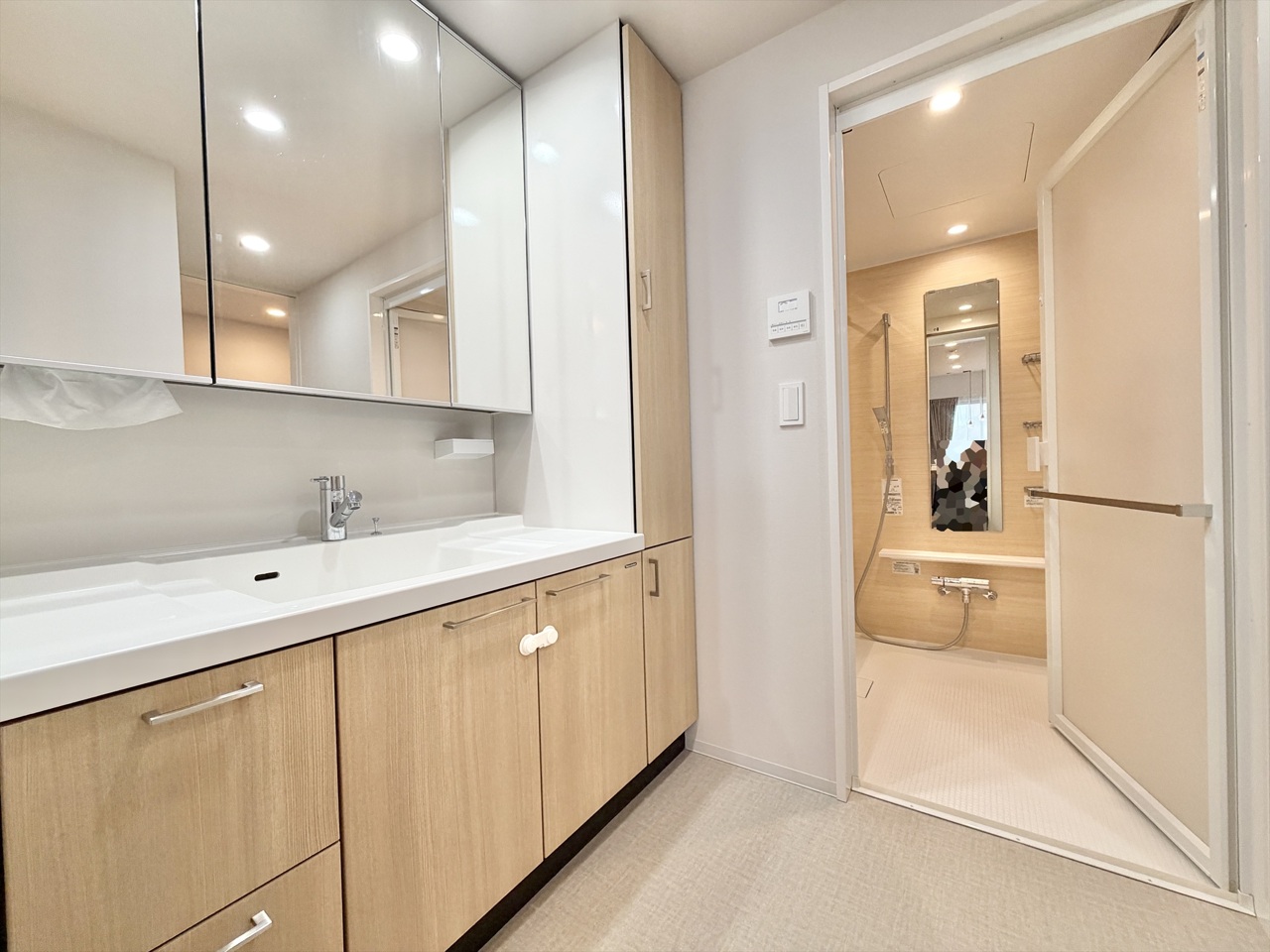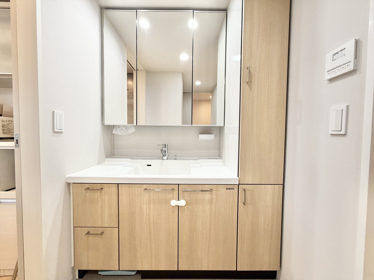洗面室には、大きな鏡の付いた洗面台を完備しております。足元の収納に加えて、鏡裏とサイドにも大きな収納がございますので、散らかりがちな洗面室もスッキリとお使い頂けます。