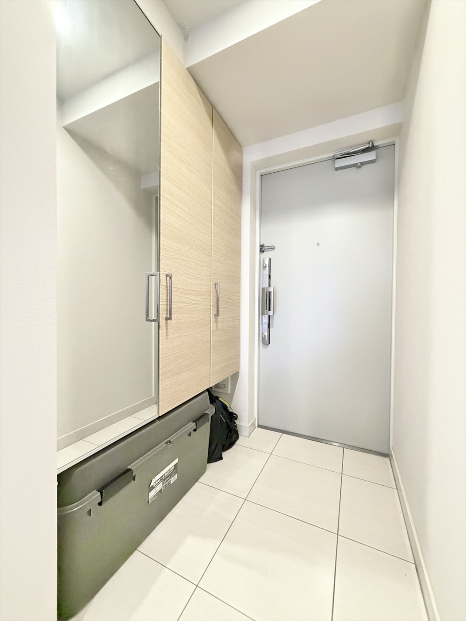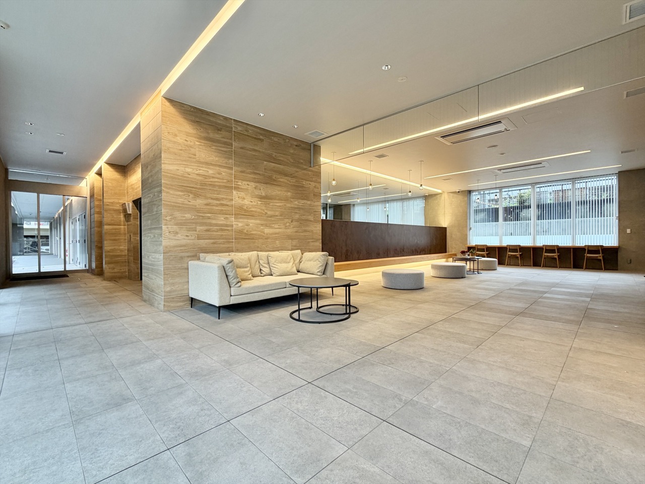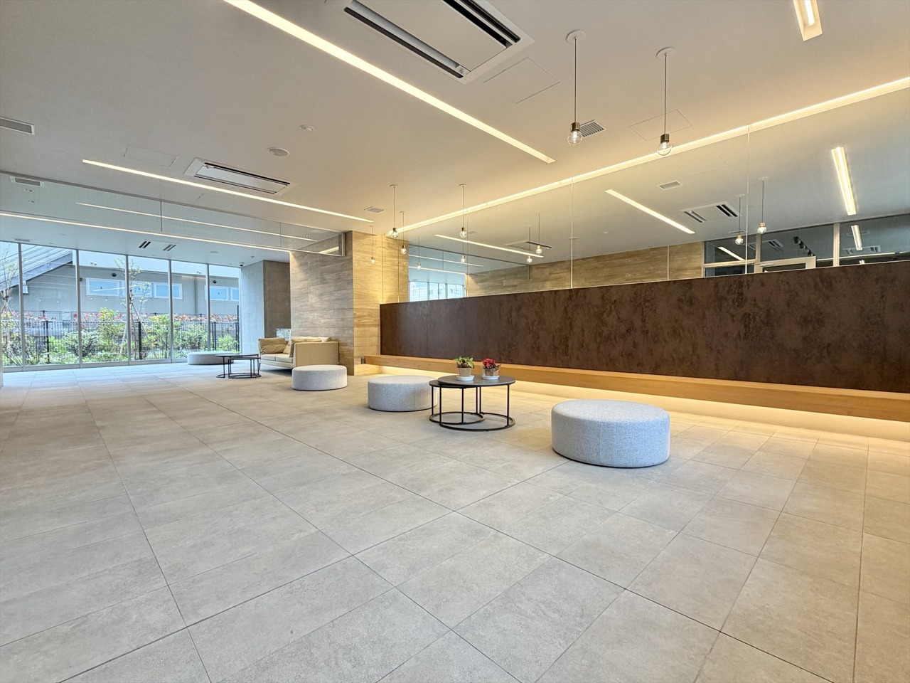 エントランスは照明と大きな鏡により、オシャレで広々とした印象を与えてくれます。ソファーもございますので、マンション内の近所さんとの情報交換の場としてもご活用いただけます。