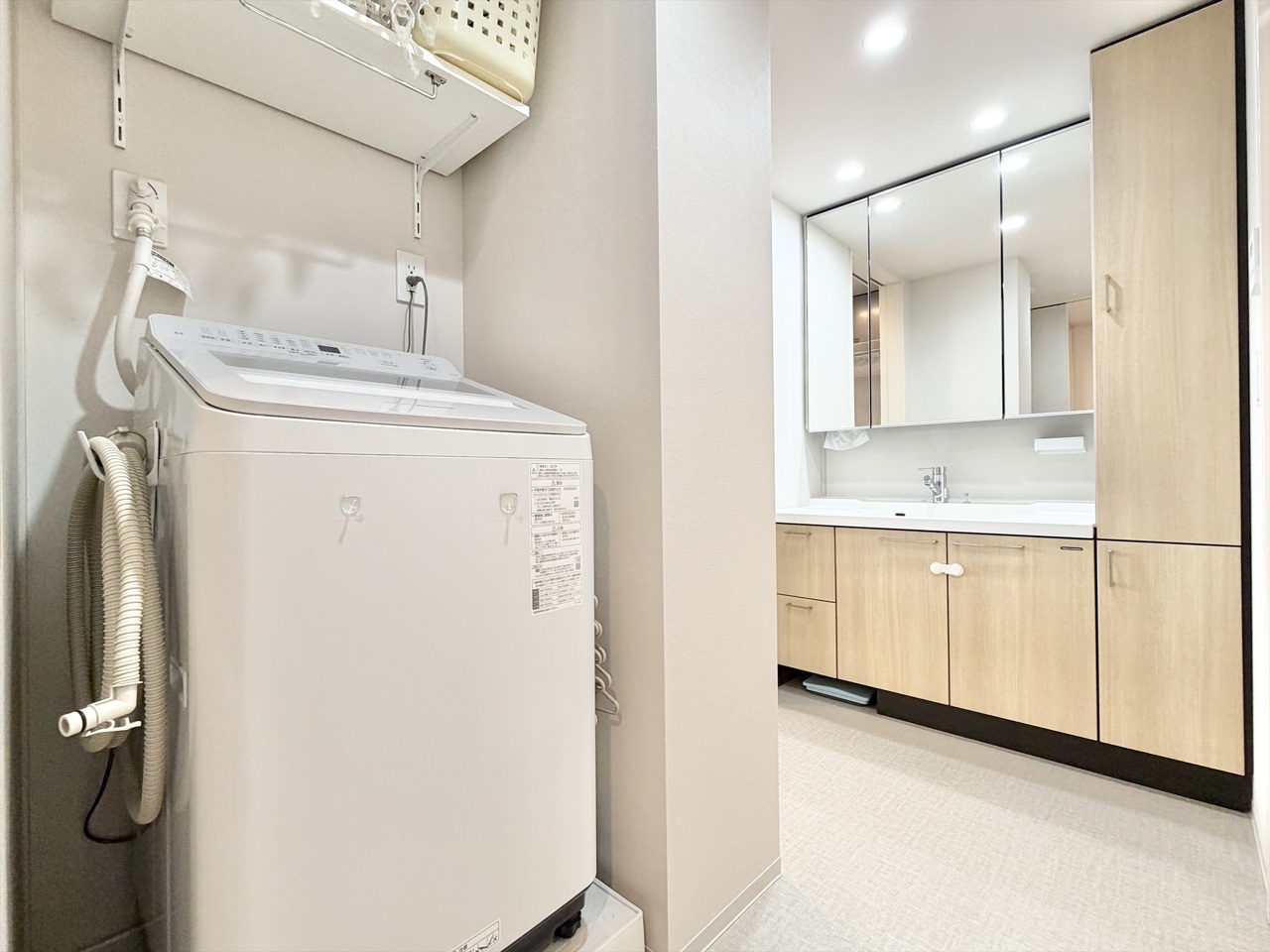 洗面室には洗濯物置き場も完備しております。キッチン側と玄関廊下の2面からアクセスできますので、動線もしっかりと考えられた住宅です。