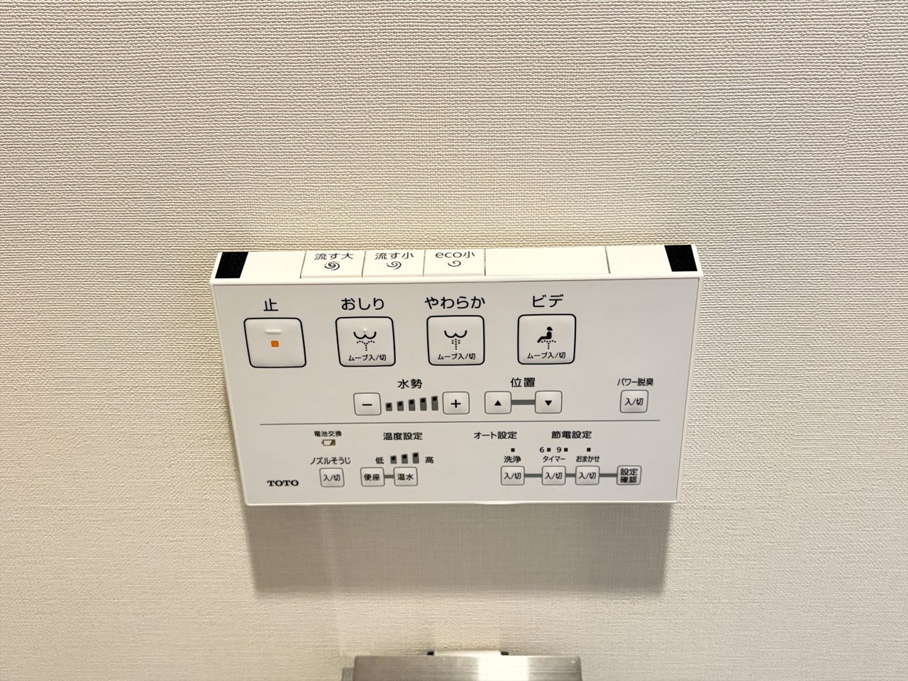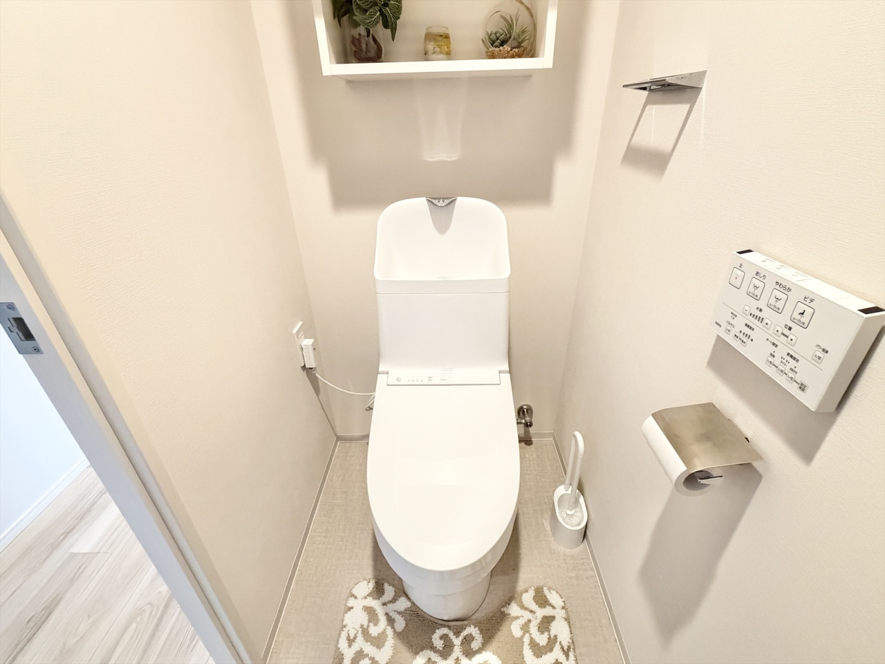 ウォシュレット付きのトイレを完備しております。上部には棚もございますので、トイレットペーパーやお掃除道具なども収納可能でございます。