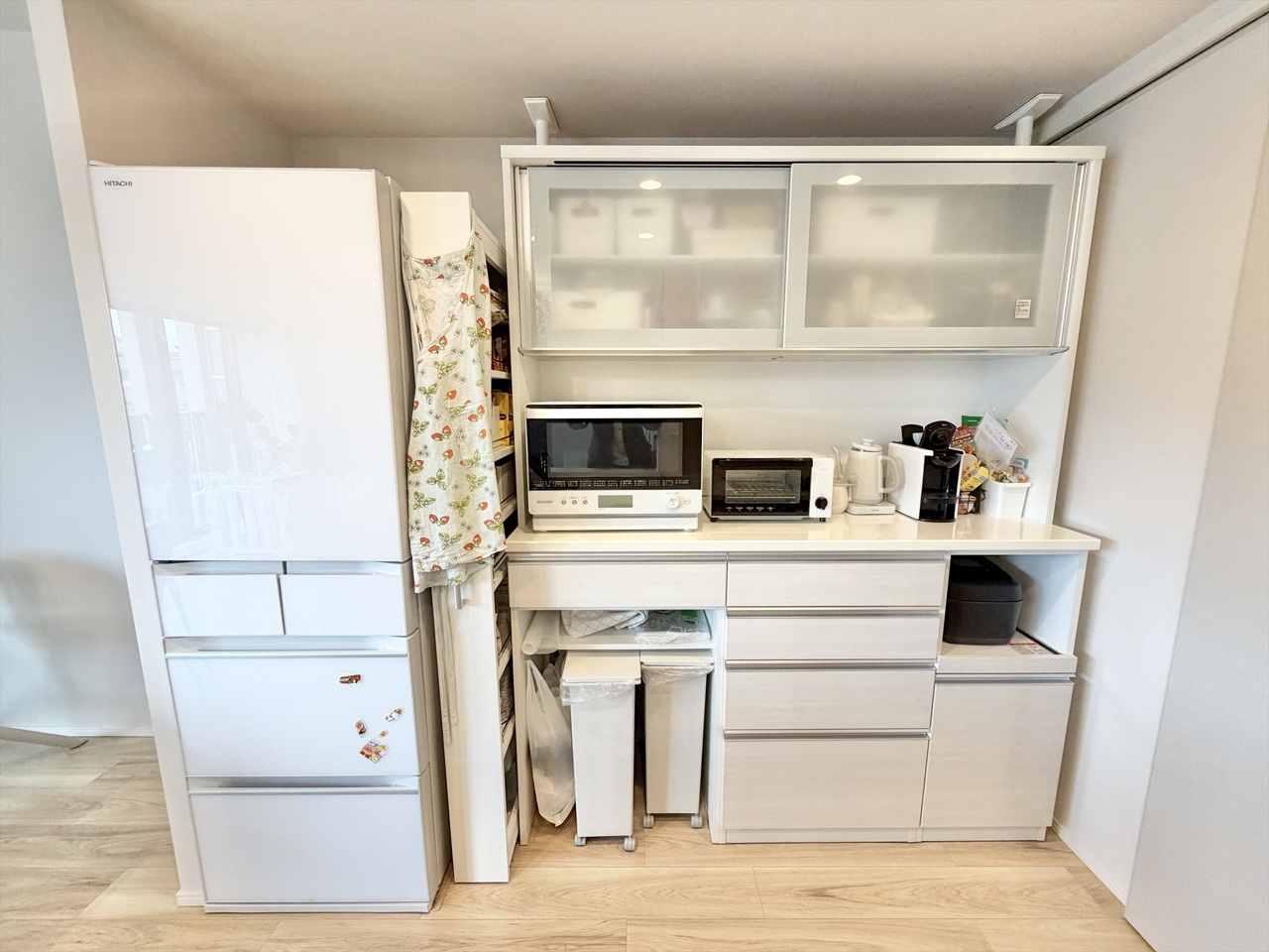 キッチン後方には、収納棚と冷蔵庫を置くスペースがございます。キッチンは3.6帖の広さがございますので、広々とお使い頂けます。
