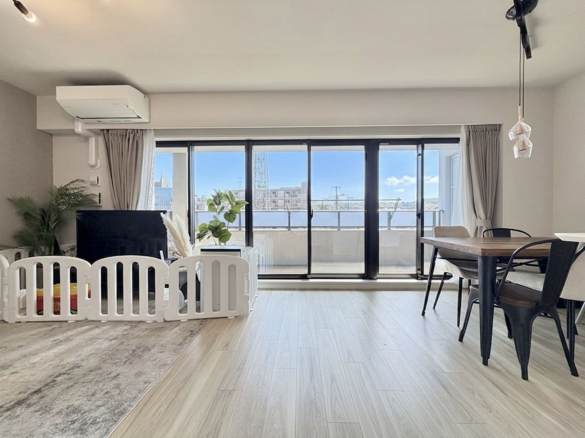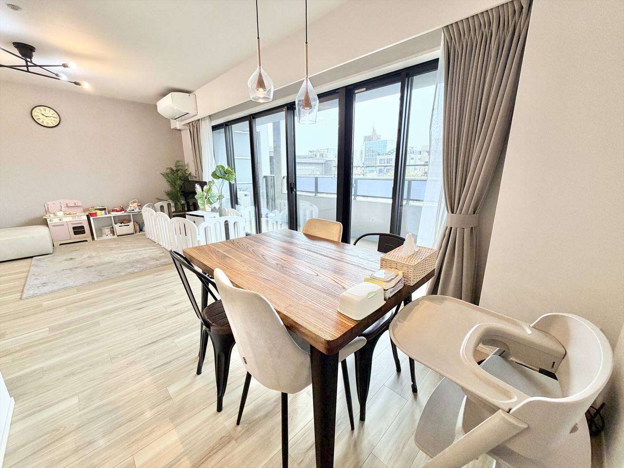 LDKには一面大きな窓がございます。青々としたお空がとても気持ち良いですね。前面には高い建物も少なく見晴らしも良好です。是非現地にて実際にご覧くださいませ。