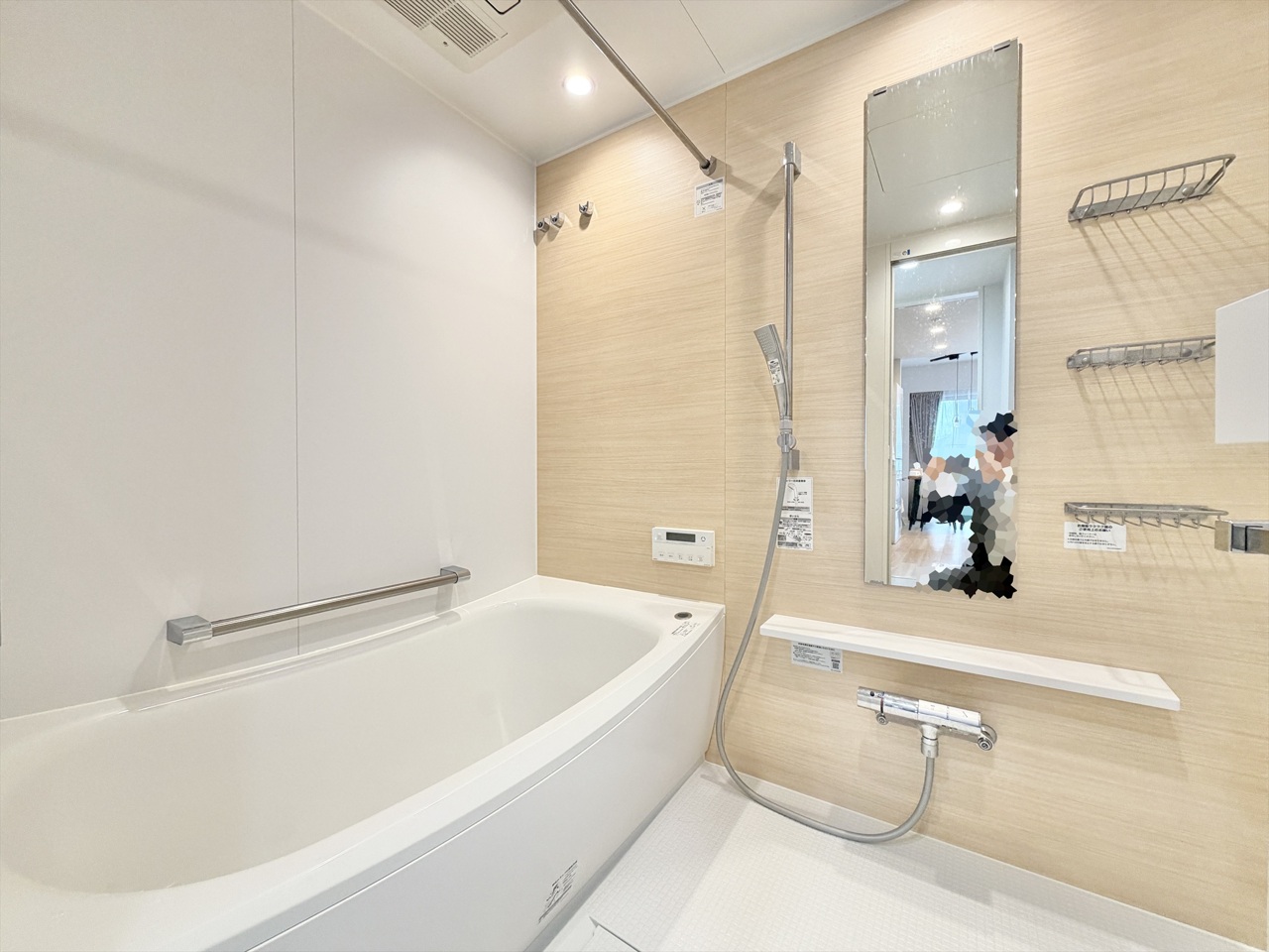 白を基調とした浴室には、木目調のアクセントを採用しております。ユニットバスは足を伸ばせるタイプの浴槽になりますのでリラックスタイムをごゆっくりお楽しみください。