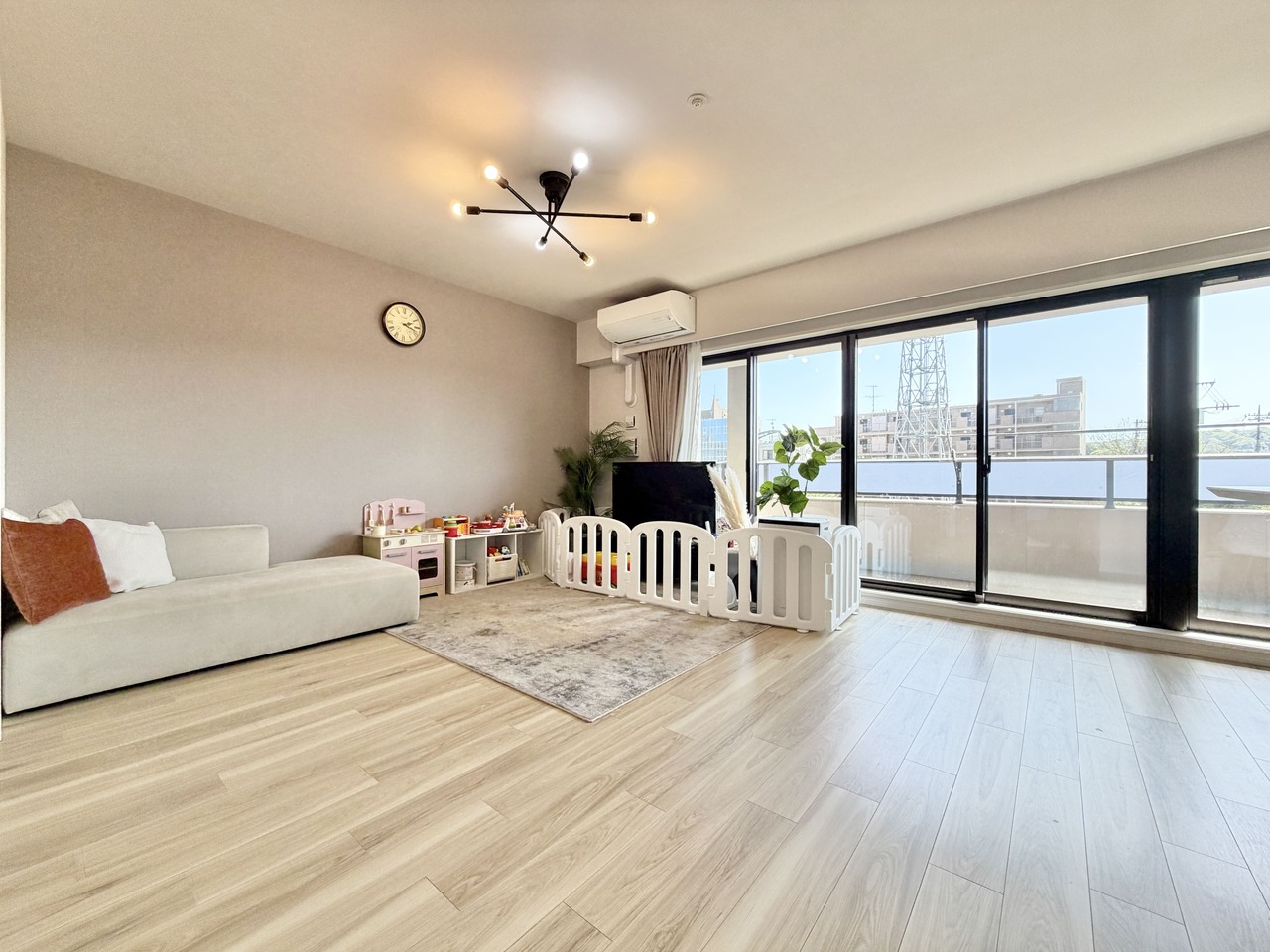 広々としたLDKですね。19.8帖ございますので、お子さまもペットものびのびとお過ごしいただけそうです。築3年・駅徒歩3分・都市ガスとその他魅力も大変詰まった住宅です。