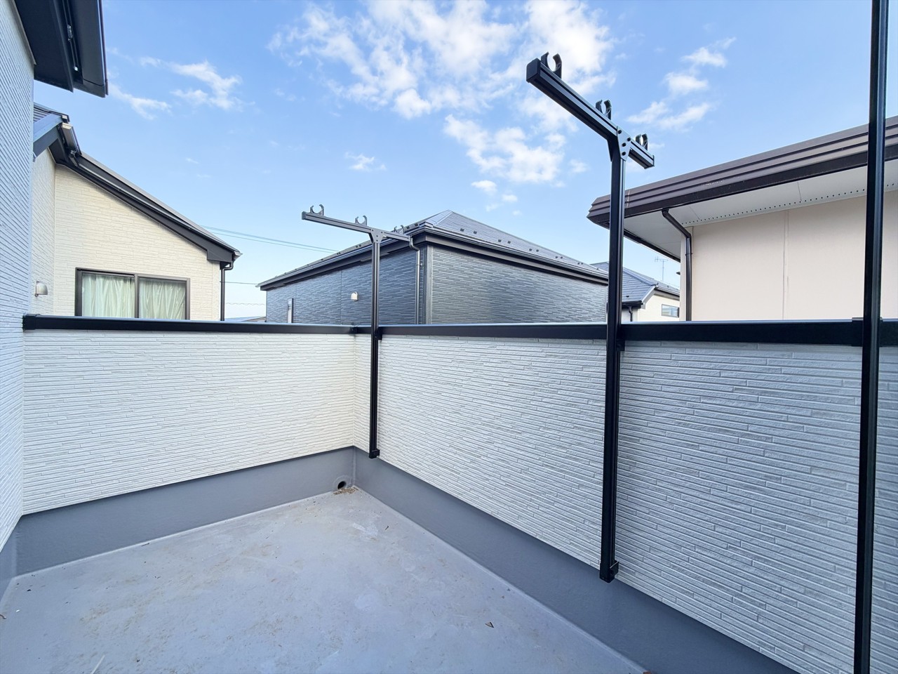 1号棟 バルコニーは、幅の広いワイドな造りとなっております。南面バルコニーとなっておりますのでお洗濯も直ぐに乾きそうです。雨の際には浴室乾燥機もございますので嬉しいですね。