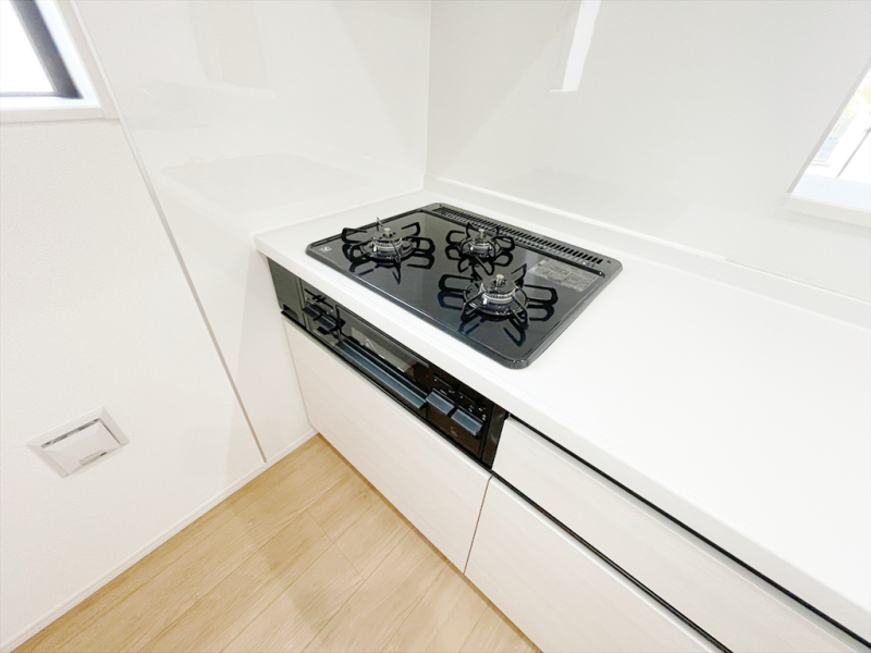 角を極力少なくした、お手入れのしやすい「すっきりクリーンごとく」。3口全てに温度センサーが付き、高温炒め機能付き。片面焼きグリルも搭載しています。消し忘れ消火機能付き、安全で機能的なガスコンロです。