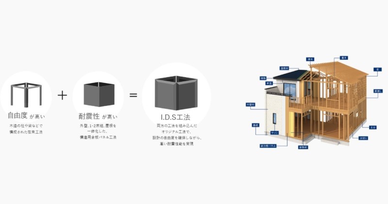 「木造軸組-パネル工法」。木造軸組工法の設計自由度と構造用合板パネル工法の耐震性の高さを併せもった工法です。 外壁、1・2階床組、屋根を構造用合板で一体化させ、高い耐震性を実現させています。