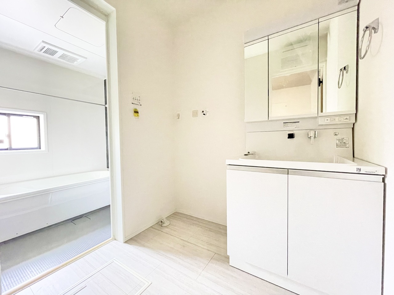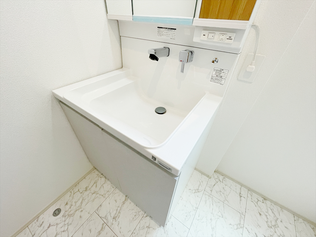 洗面化粧台スペース。広々とした空間で忙しい朝に活躍。