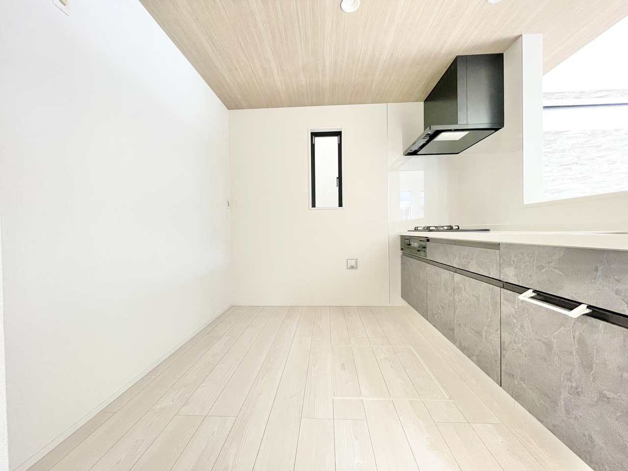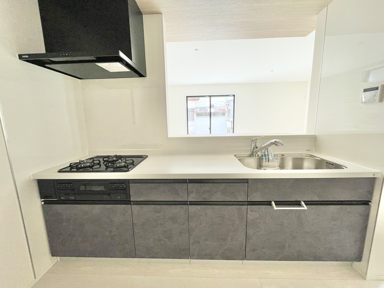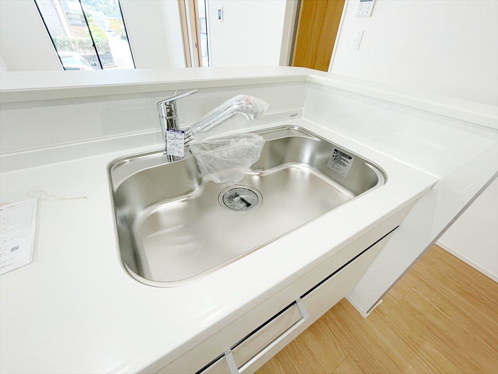 モダンなデザインの対面式システムキッチン。広々とした空間です。カップボードなどのオプションも相談たまわります。
