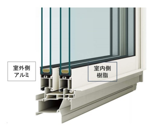 耐久性や強度が高いアルミを外側に、断熱性や気密性に優れた樹脂を内側にして複合することで、耐久性と強度、断熱性、気密性という窓に必要な要素を取り入れたサッシになっています。