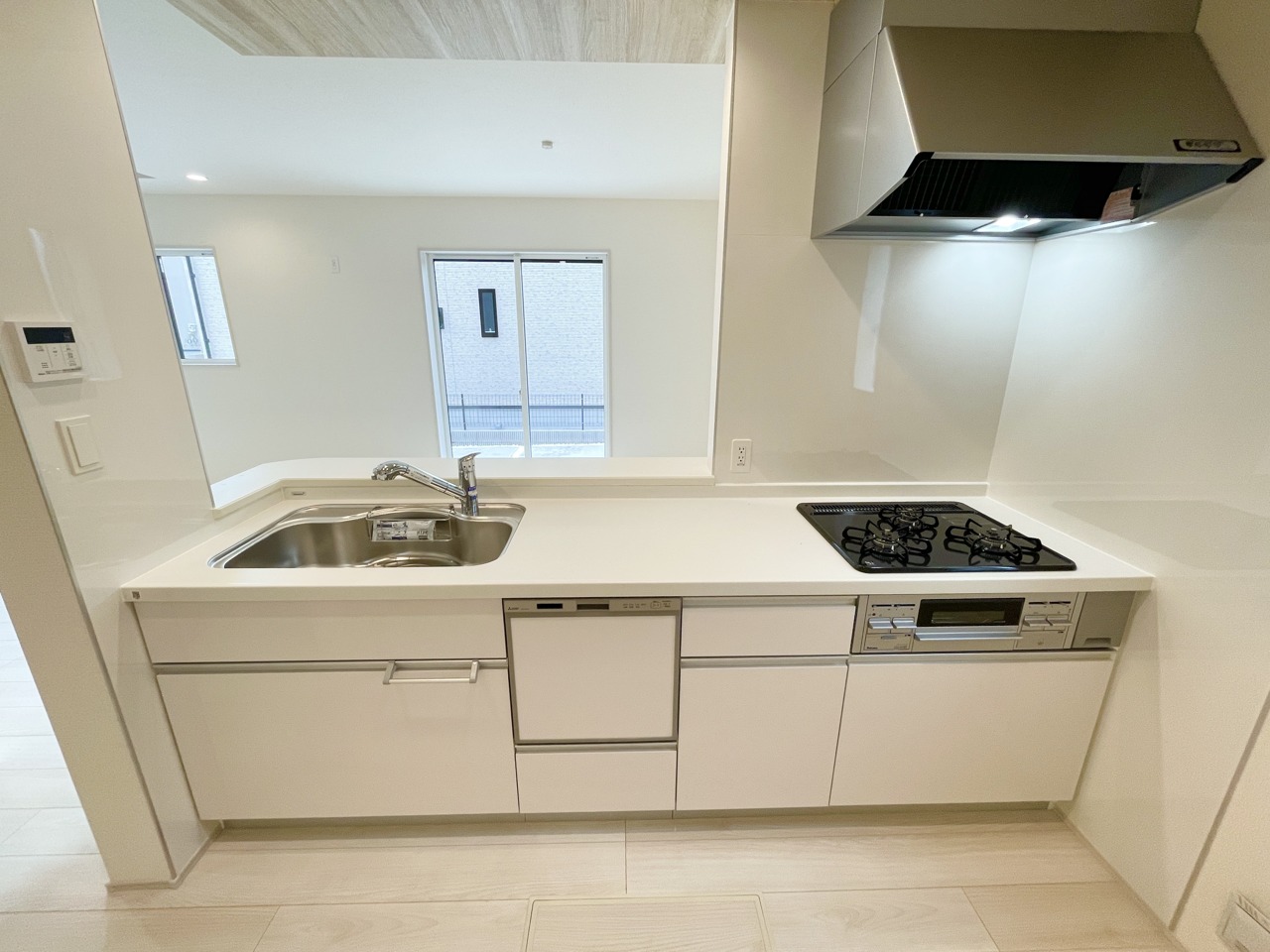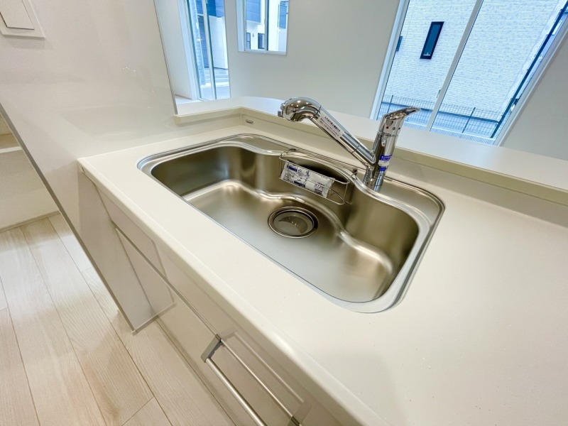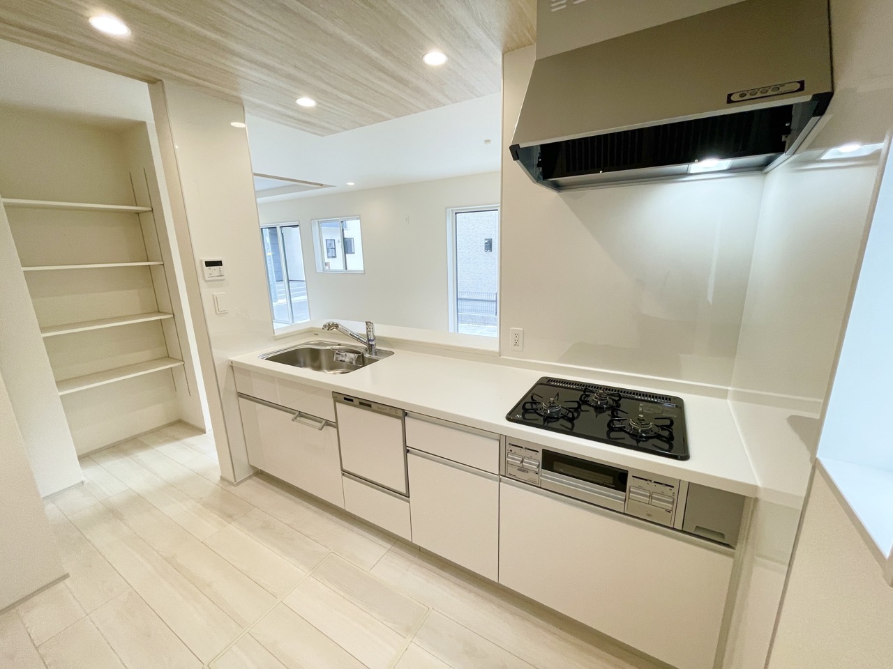 ホワイト調で清潔感のあるシステムキッチン。隣には可動棚付きの収納があるため、ストック収納にも便利です