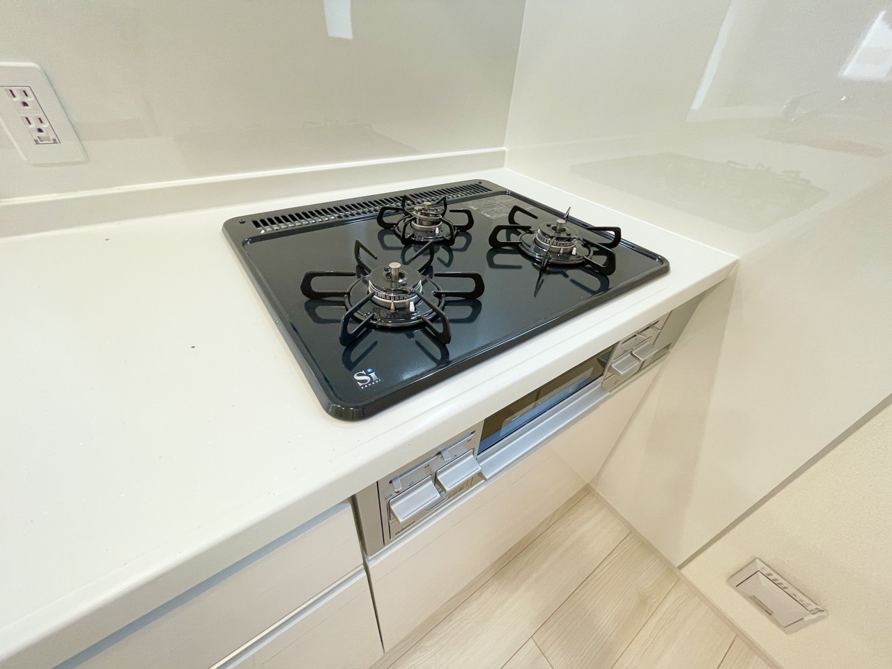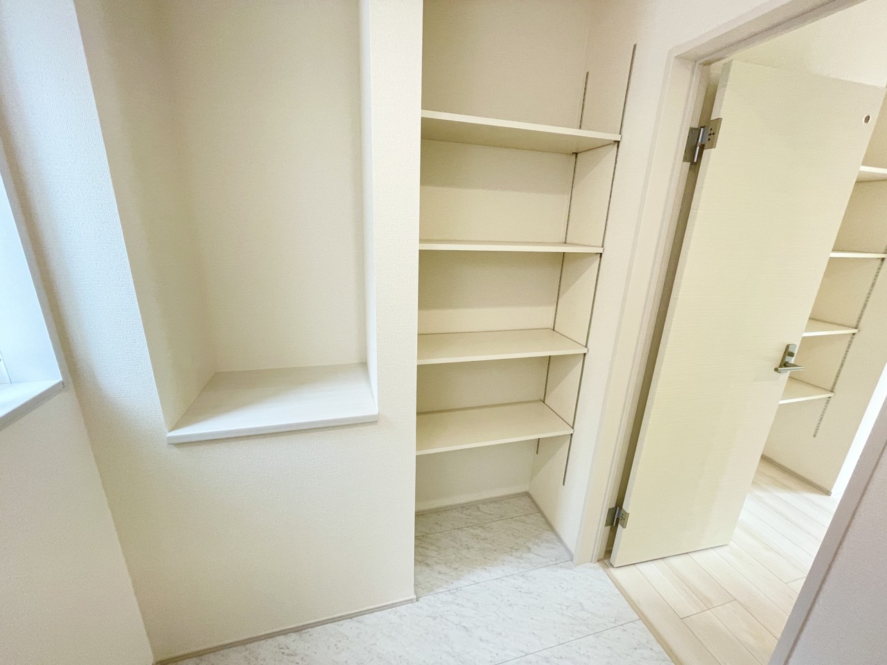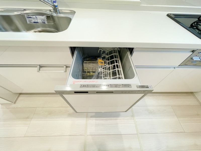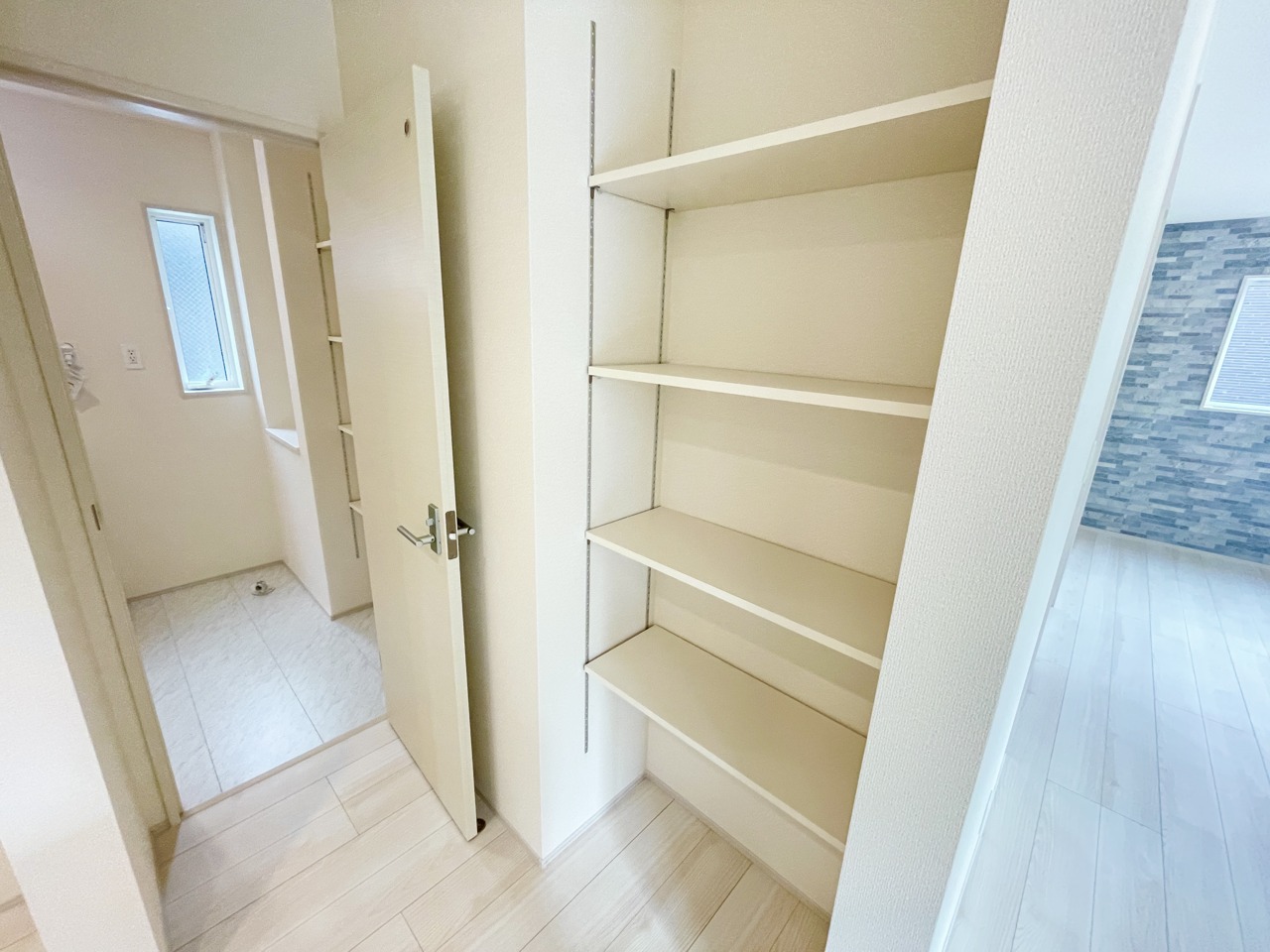 ホワイト調で清潔感のあるシステムキッチン。隣には可動棚付きの収納があるため、ストック収納にも便利です