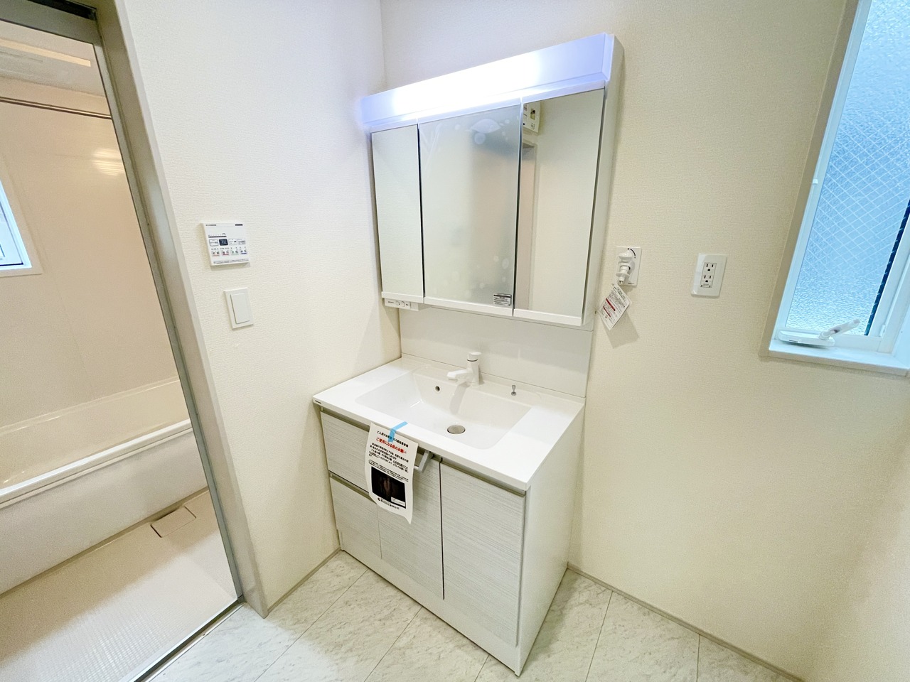 散らかりがちな洗面台は、鏡裏+足元収納付き。