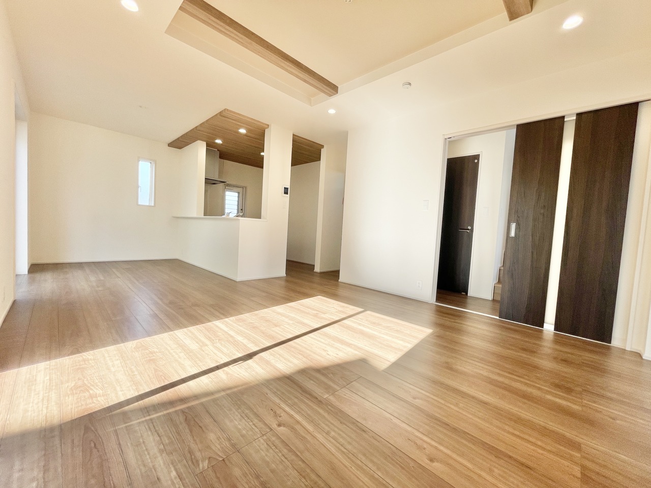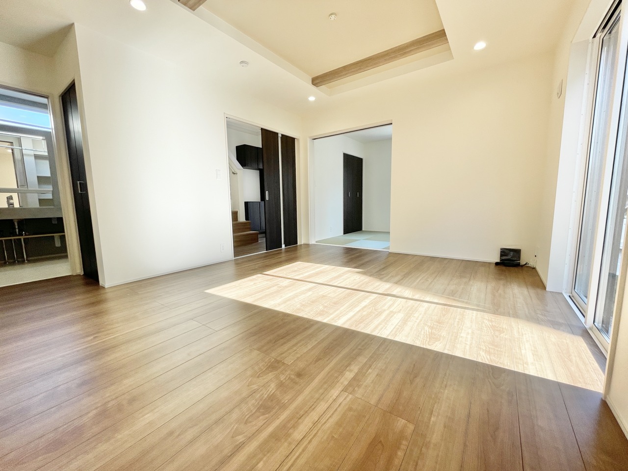陽光がたっぷり差し込む広々リビングが魅力の一邸。明るさとぬくもりに包まれた空間で、家族の時間がもっと心地よくなる住まいです。