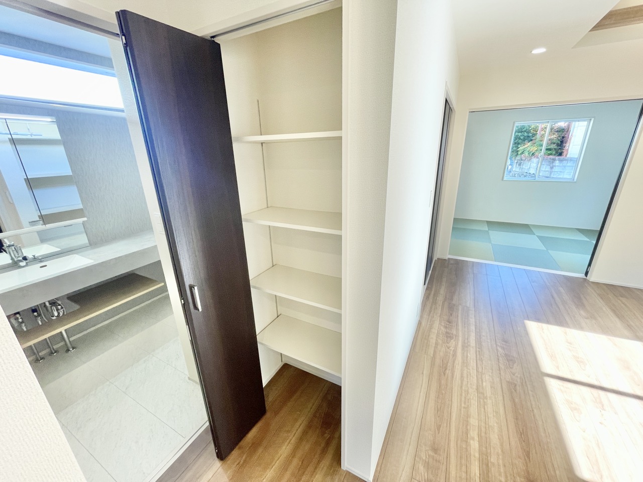 明るい洗面所には、タオルや日用品をすっきり収納できる便利なリネン庫付き!家事動線も良く、毎日の支度がスムーズに。清潔感あふれる空間で、家族みんなが快適に使える、うれしい工夫が詰まった住まいです。
