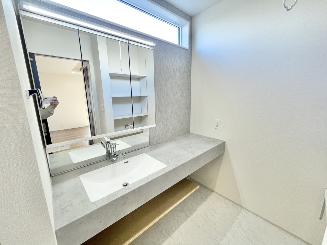 毎日がちょっと嬉しくなる、ひろびろ洗面スペース♪ 明るい採光と使いやすいカウンターで、朝の支度もゆったり快適。収納もたっぷりで家族みんなが気持ちよく使える、心地よい住まいです。
