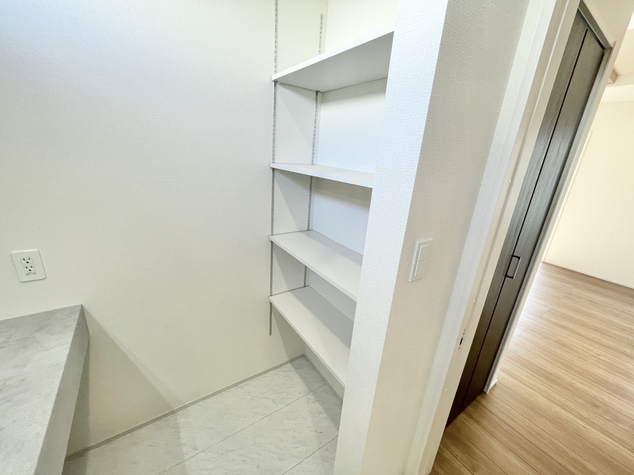 明るい陽射しが差し込む廊下横のパントリーは、収納力たっぷりで家事がもっとスムーズに。キッチン動線も良く、毎日の暮らしがちょっと嬉しくなる住まいです。