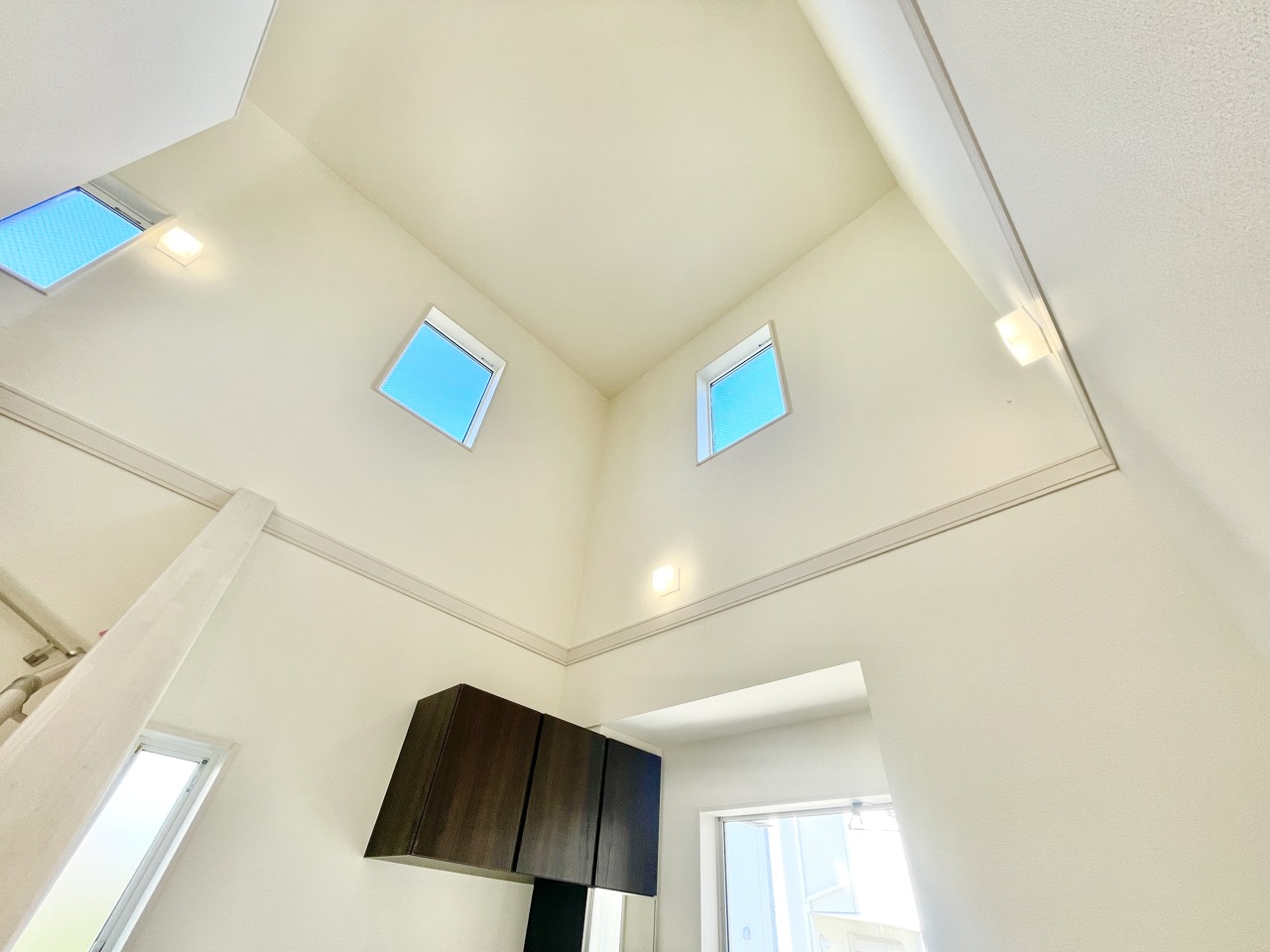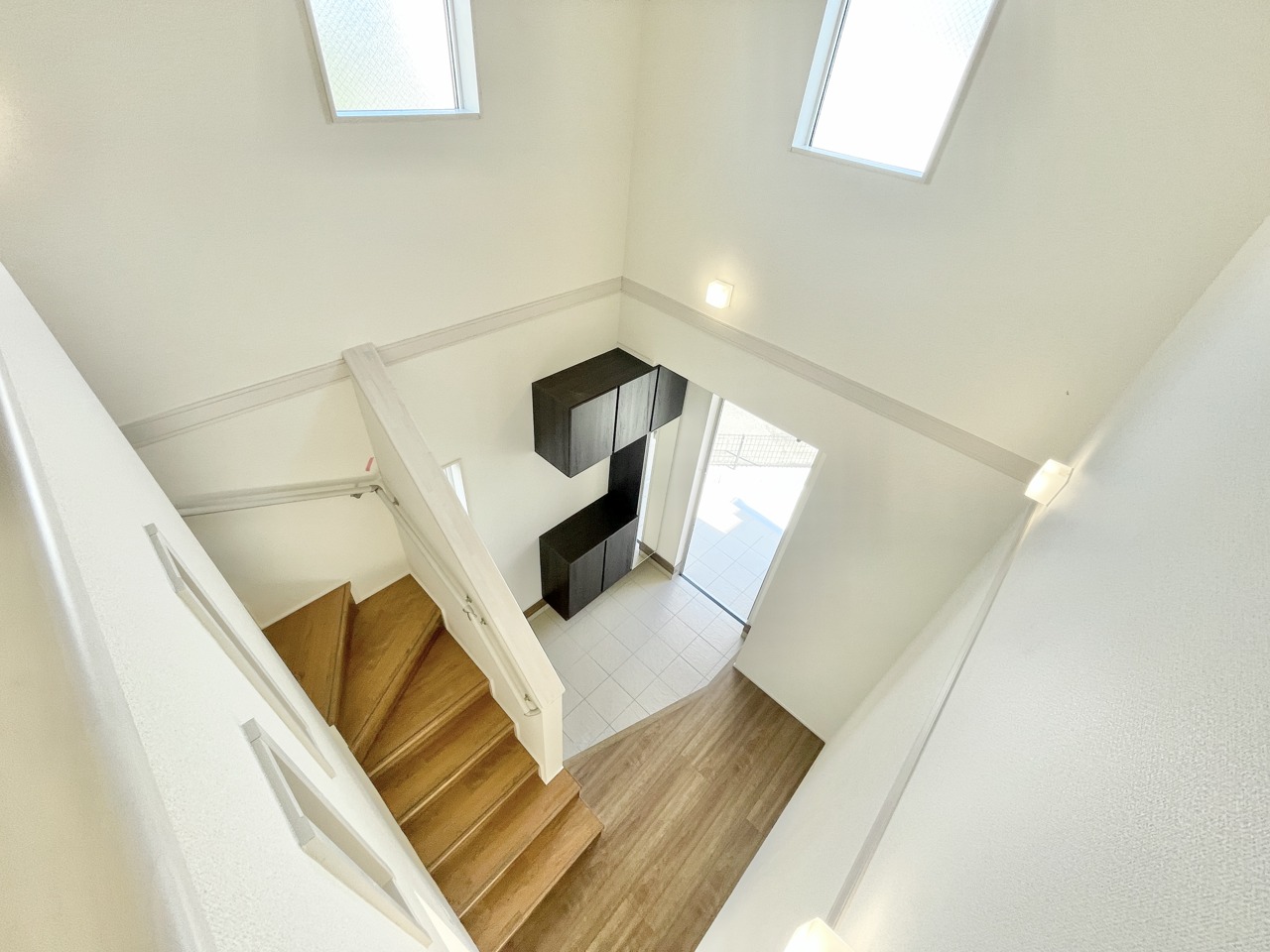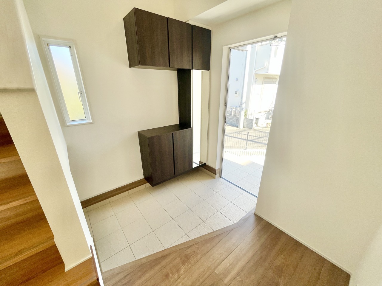吹き抜けの開放感が魅力の玄関!小窓から差し込む優しい光が、毎日の「おかえり」をふんわり明るく包み込みます。収納もたっぷりで家族みんなが使いやすい、心地よい住まいのスタートにぴったりです。