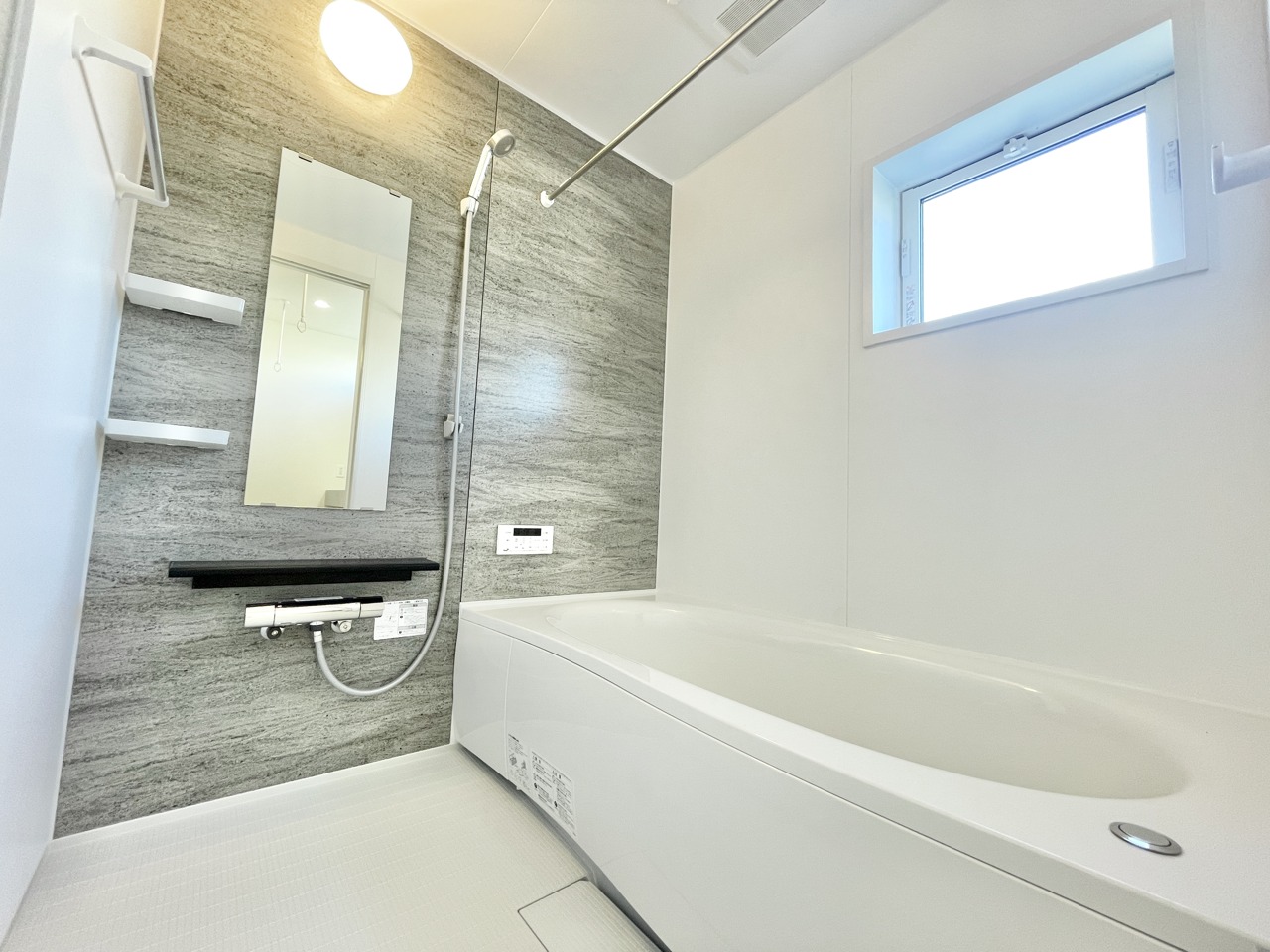 「毎日の疲れをそっとほどく、明るく清潔感あふれるバスルーム。小窓からのやわらかな光が心地よく、家族みんながリラックスできる癒しの空間です。」 ■浴室乾燥機付き