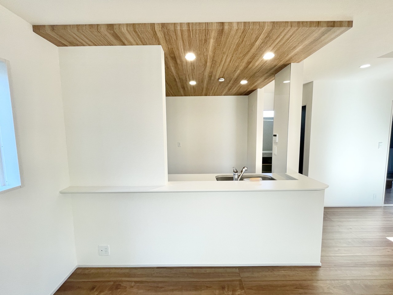 家族の気配を感じながら料理が楽しめるカウンターキッチン。温かみある木目天井がリビングと優しくつながり、毎日の暮らしに“ちょっと心地いい”をプラスしてくれる住まいです。