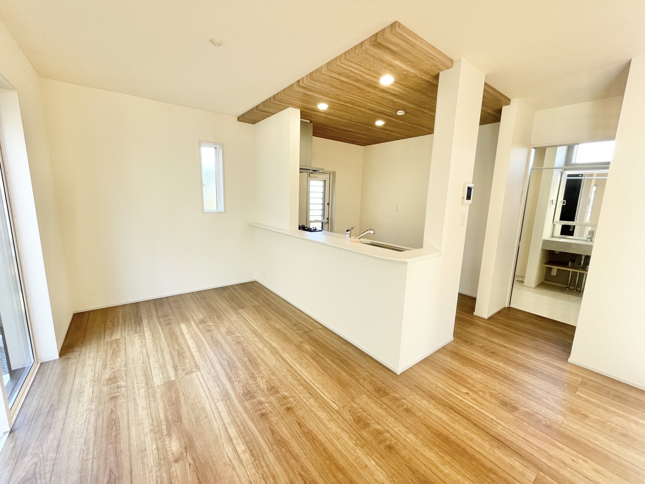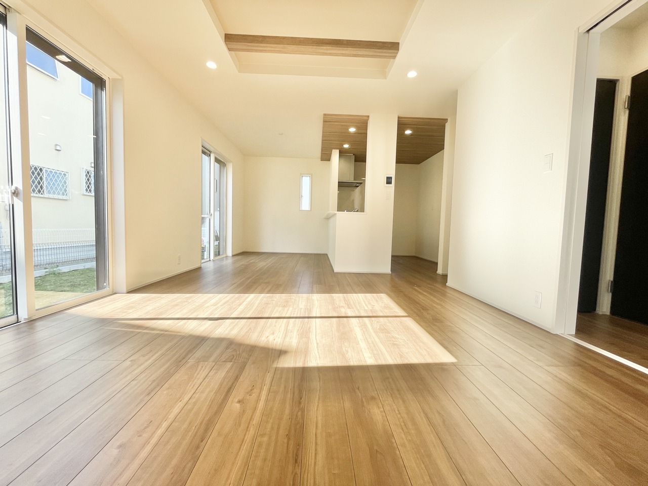 陽射しがたっぷり差し込む明るいリビングが魅力の一邸。木目の温もりが心地よく、家族がゆったり集まれる広々空間です。毎日が少し特別になる住まいです。