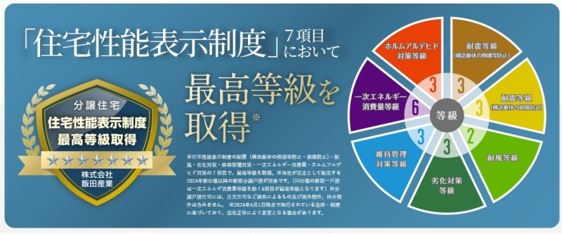 住宅性能表示制度に対応し、耐震等級(構造躯体の倒壊等防止・損傷防止)・耐風等級・劣化対策等級・維持管理対策等級・ホルムアルデヒド対策等級で一番上の等級を取得しています。