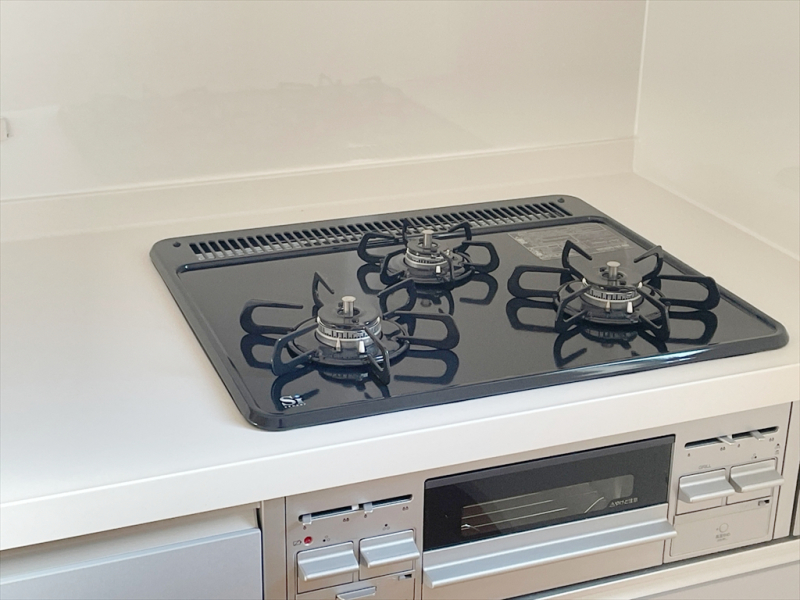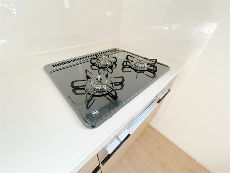 角を極力少なくした、お手入れのしやすい「すっきりクリーンごとく」。3口全てに温度センサーが付き、高温炒め機能付き。片面焼きグリルも搭載しています。消し忘れ消火機能付き、安全で機能的なガスコンロです。