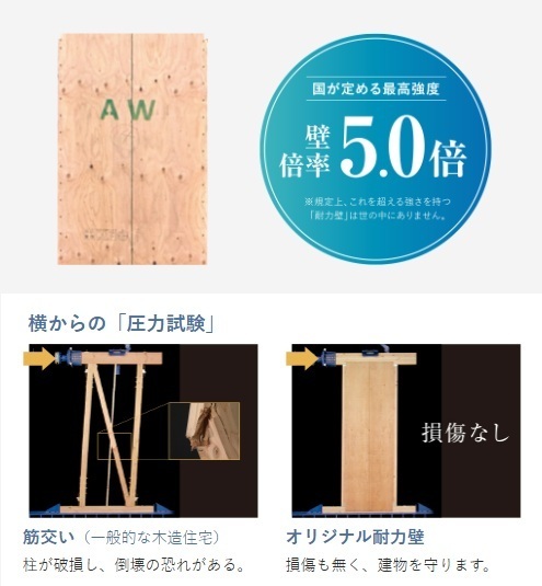 作業工程の効率を向上させながら、耐震性を高めるため、壁パネルは、高強度の「オリジナル耐力壁」を採用し、壁倍率5倍を実現。