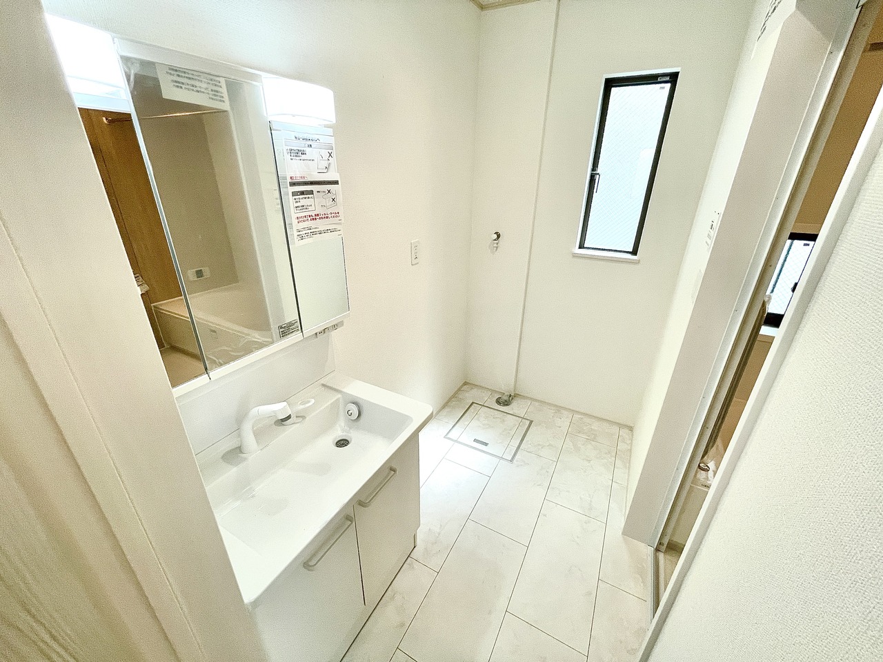 三面鏡は真正面から見ただけでは気付けない色んな角度から確認でき、収納スペースが豊富であるということがメリットです。また、シャワーヘッド付きの水栓です。ミラー扉の内側がすべて収納スペースになっています。