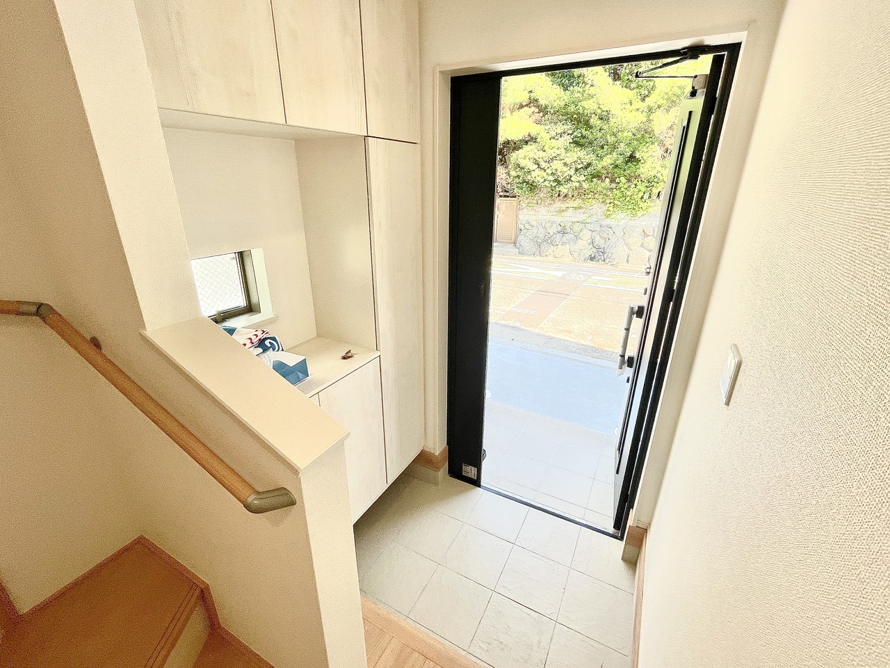 ■玄関 ゆとりのある玄関です。 シューズの収納もでき、カウンター台もあるので、飾り棚に使用したりもできます。