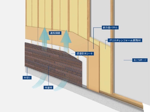 壁体内の湿気を透湿防水シートという材料で壁を覆い、外壁材との間に外気が流れる層をつくることによって、壁内の湿気を透湿防水シートから通気層を通して外部に放出する手段が「外壁通気工法」です。