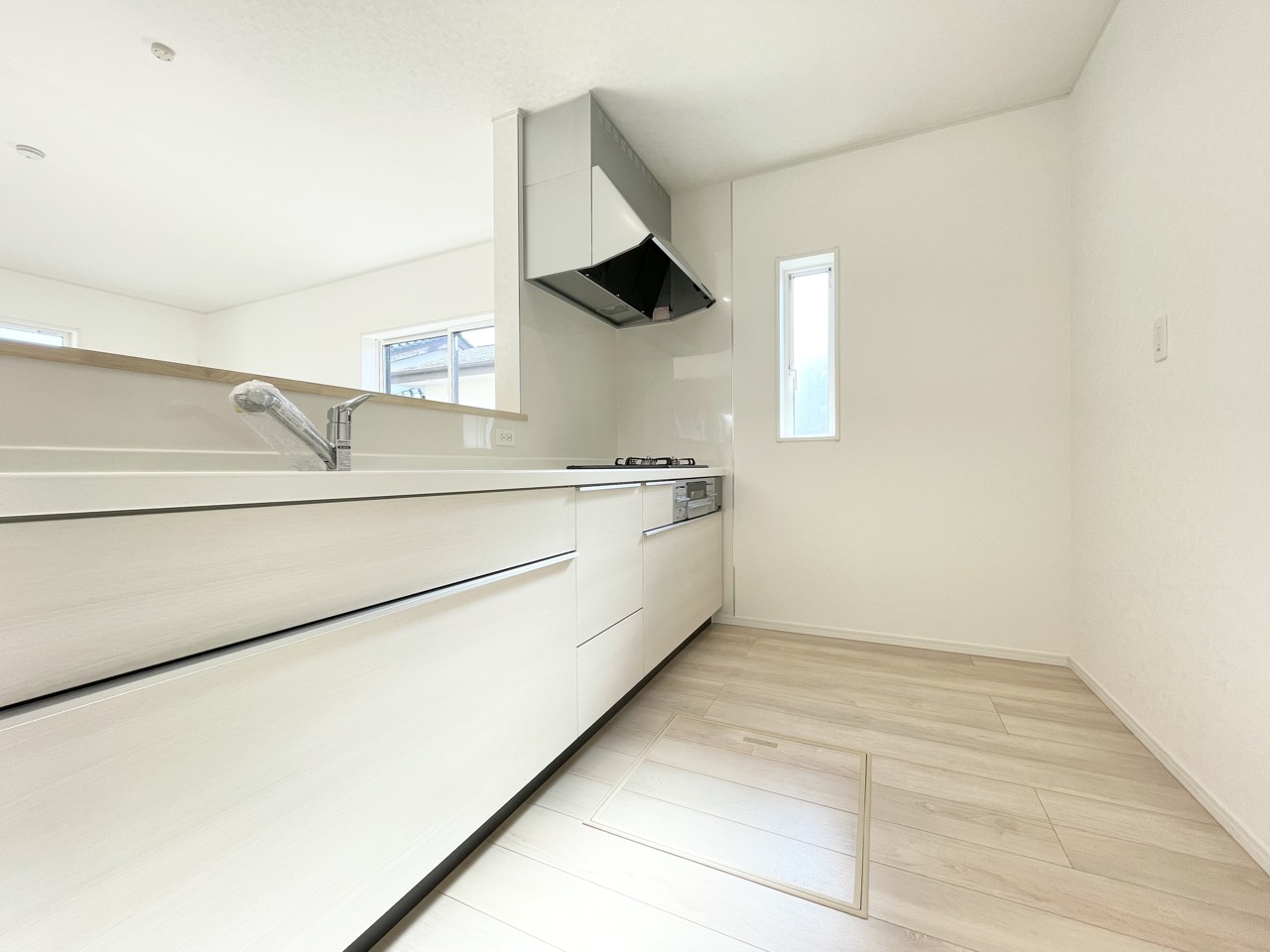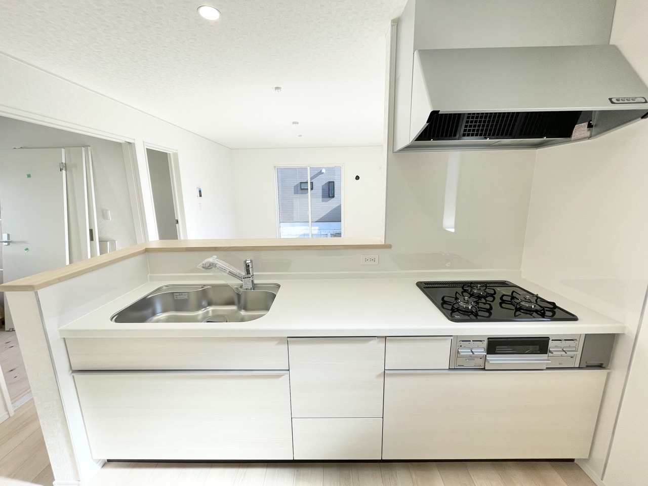 1号棟 開放的な対面式システムキッチン。ゆとりあるスペースでお料理時間を助けます。清潔感ある白を基調としたデザイン。