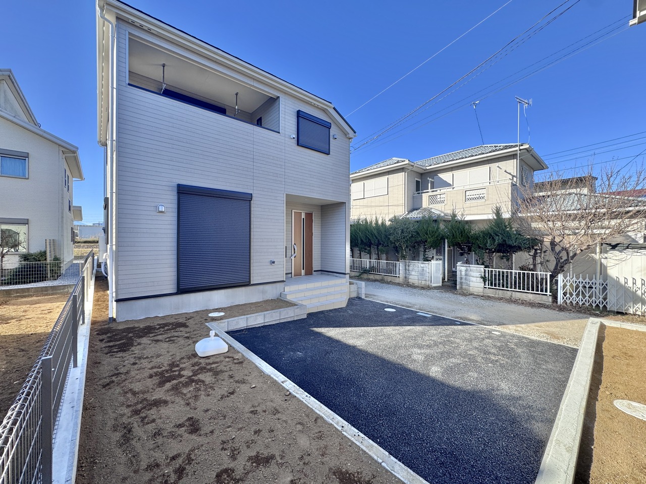 1号棟 建物全体は白を基調としたデザインで清潔感を感じられます。完成したばかりの新築戸建を是非一度ご覧になってみてください。