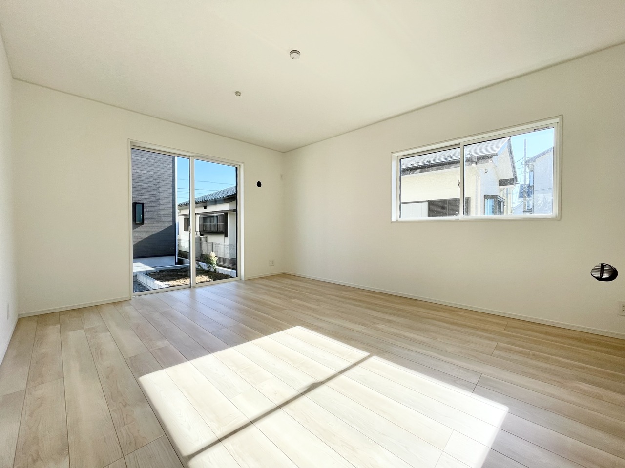 1号棟 2階約7帖のバルコニーに面している洋室。南向きで陽当たりと開放感が良好です。